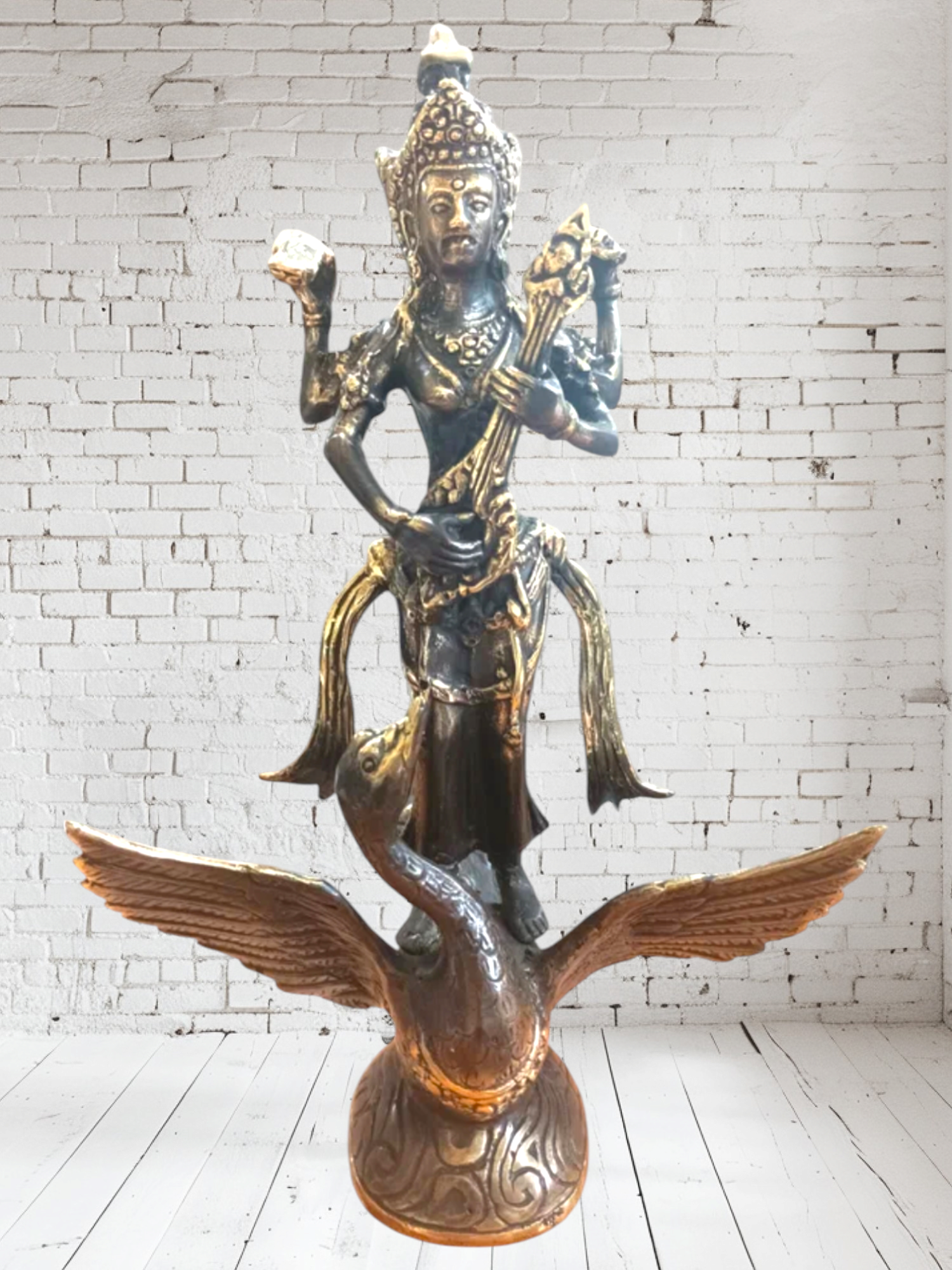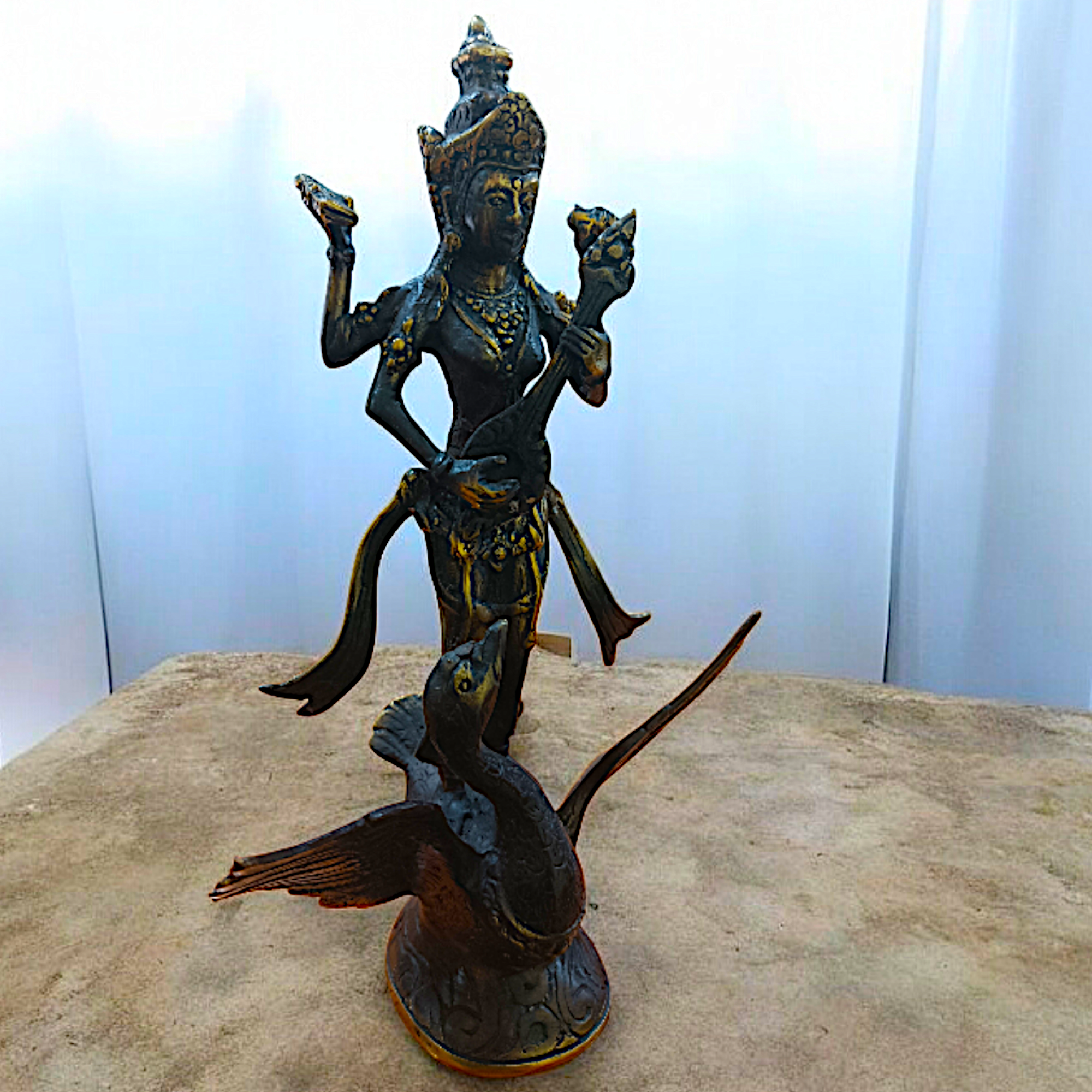 Купить Бронзовая фигура Богиня мудрости Сарасвати на лебеде 25 см / Большая статуэтка из бронзы ручной работы, Индонезия