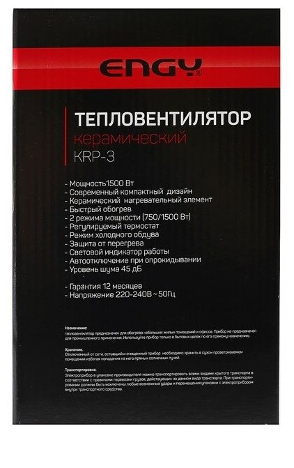 Тепловентилятор ENGY KRP-3, керамический, 1500 Вт, 3 режима работы, черный