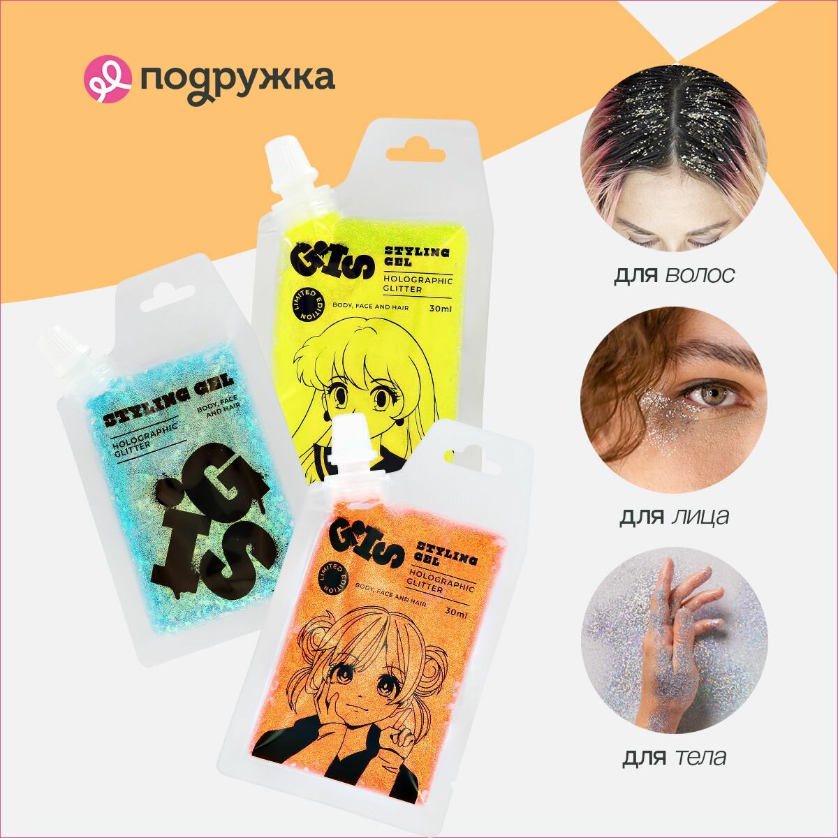 Глиттер-гель GIS для волос, лица и тела, оттенок Yellow, 30 мл