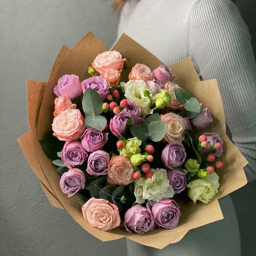 | Состав | роза пионовидная лавандер баблс - 5 шт. роза пионовидная мадам бомбастик - 6 шт.,эустома - 3 шт.,гиперикум - 3 шт.,эвкалипт - 5 шт.,упаковка крафт дизайнерский - 3 шт.,лента атласная - 1 шт. |