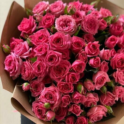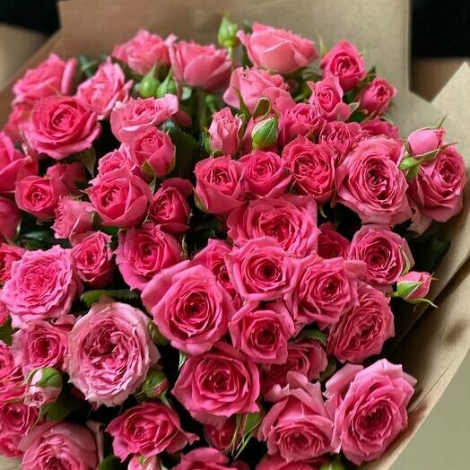Купить Букет живых цветов из 25 розовых кустовых роз в крафт упаковке 134