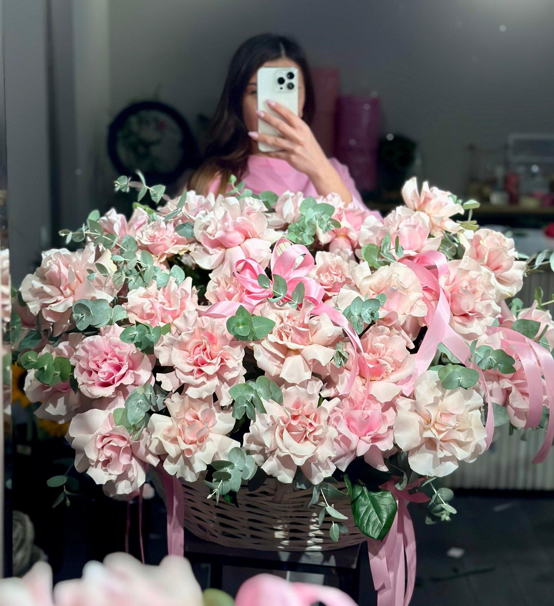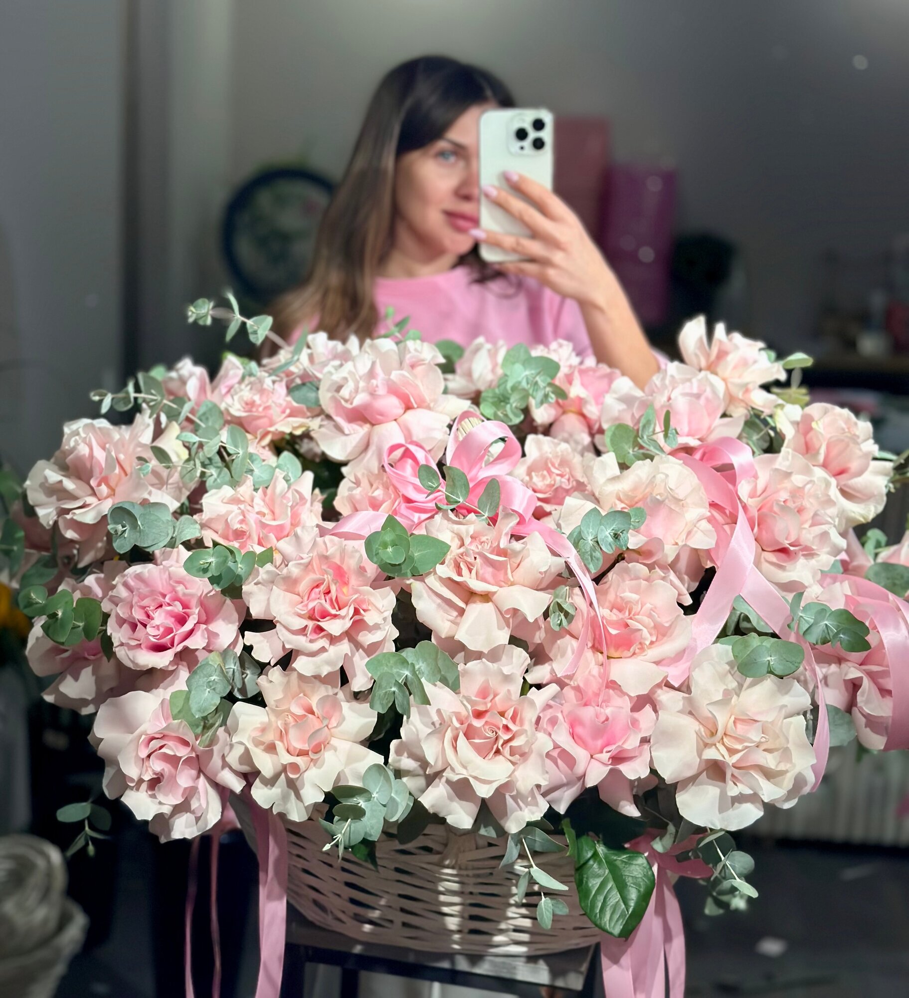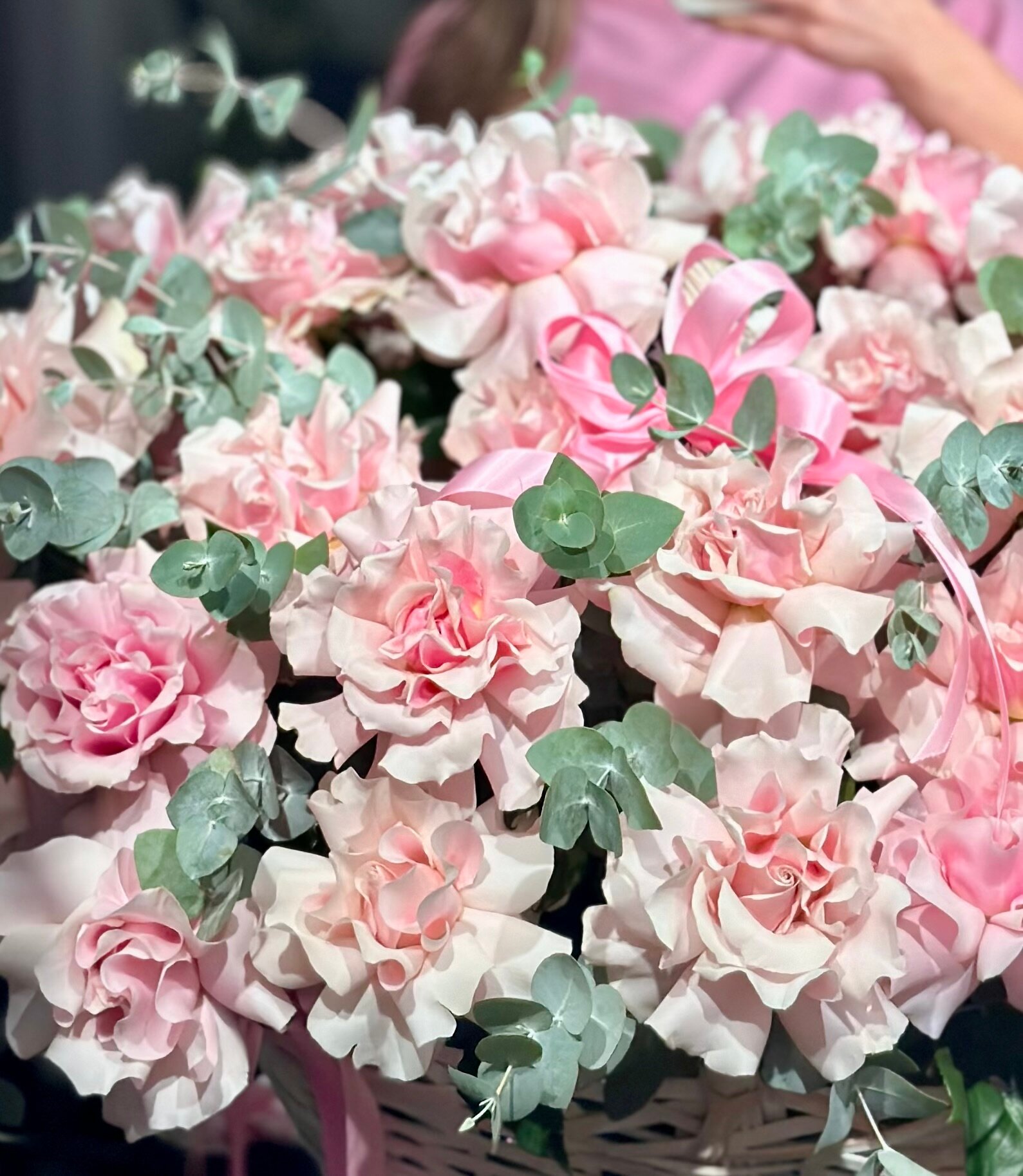 Купить Большая корзина с розовыми французскими розами и эвкалиптом, XXL композиция в корзине с доставкой от DD Flowers