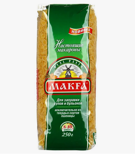 Макароны пшеничные для заправки бульонов и супов, ракушки, 250 г, 2 шт.