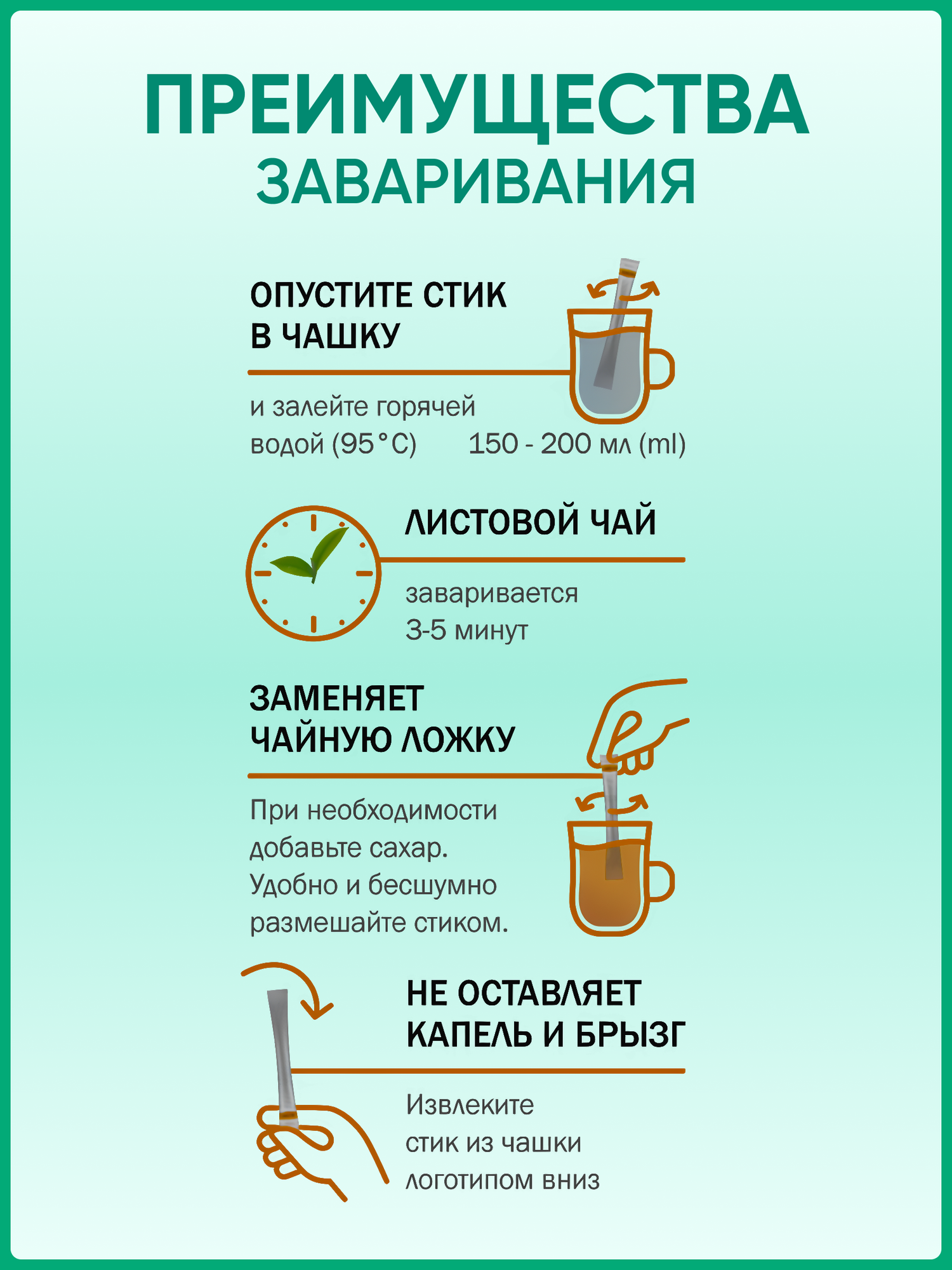 | Способ приготовления | опустите стик в чашку (150-200 мл), залейте горячей водой (95°C), дайте настояться (3-5 мин.), при необходимости добавьте сахар, перемешайте стиком |