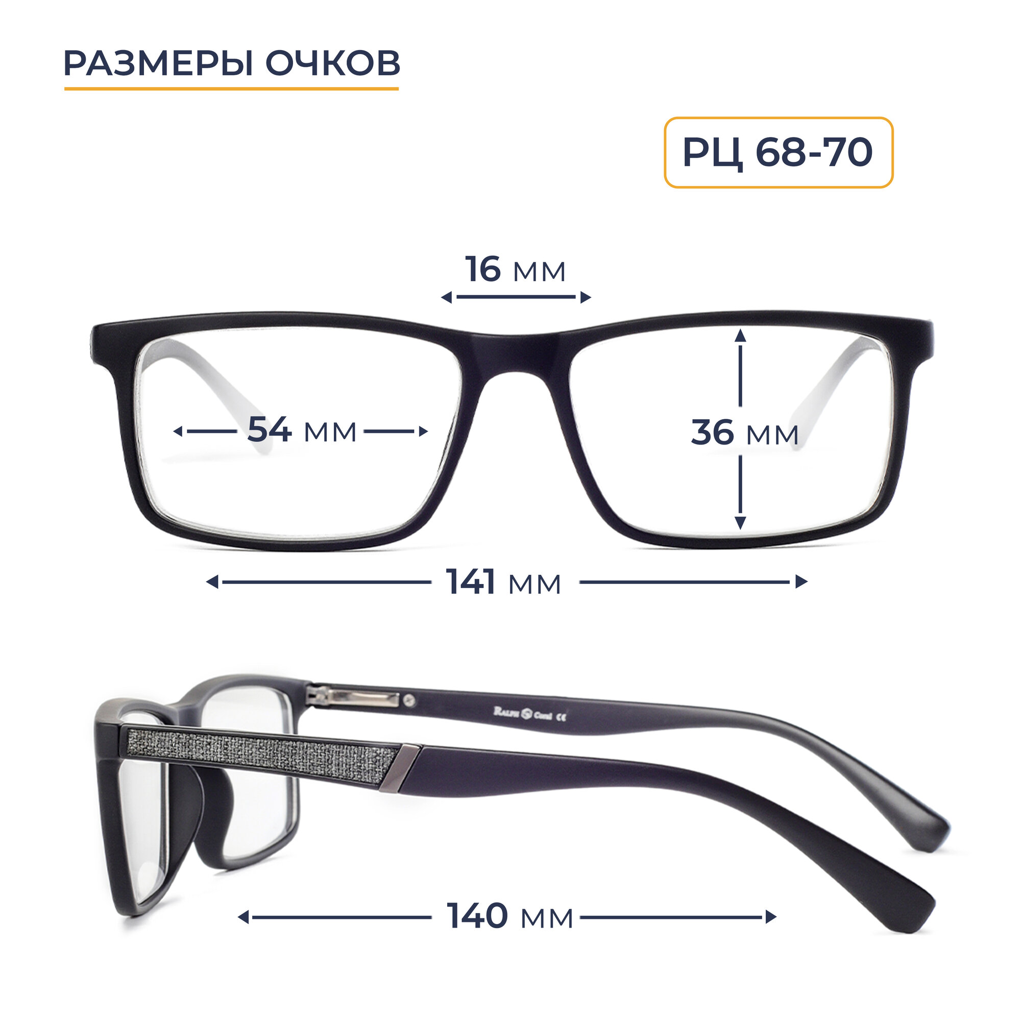 Очки корригирующие мужские-женские 68-70 (+1.25) RALPH 0682 C2, с футляром, цвет черный, заушник синий, линзы пластик, РЦ 68-70