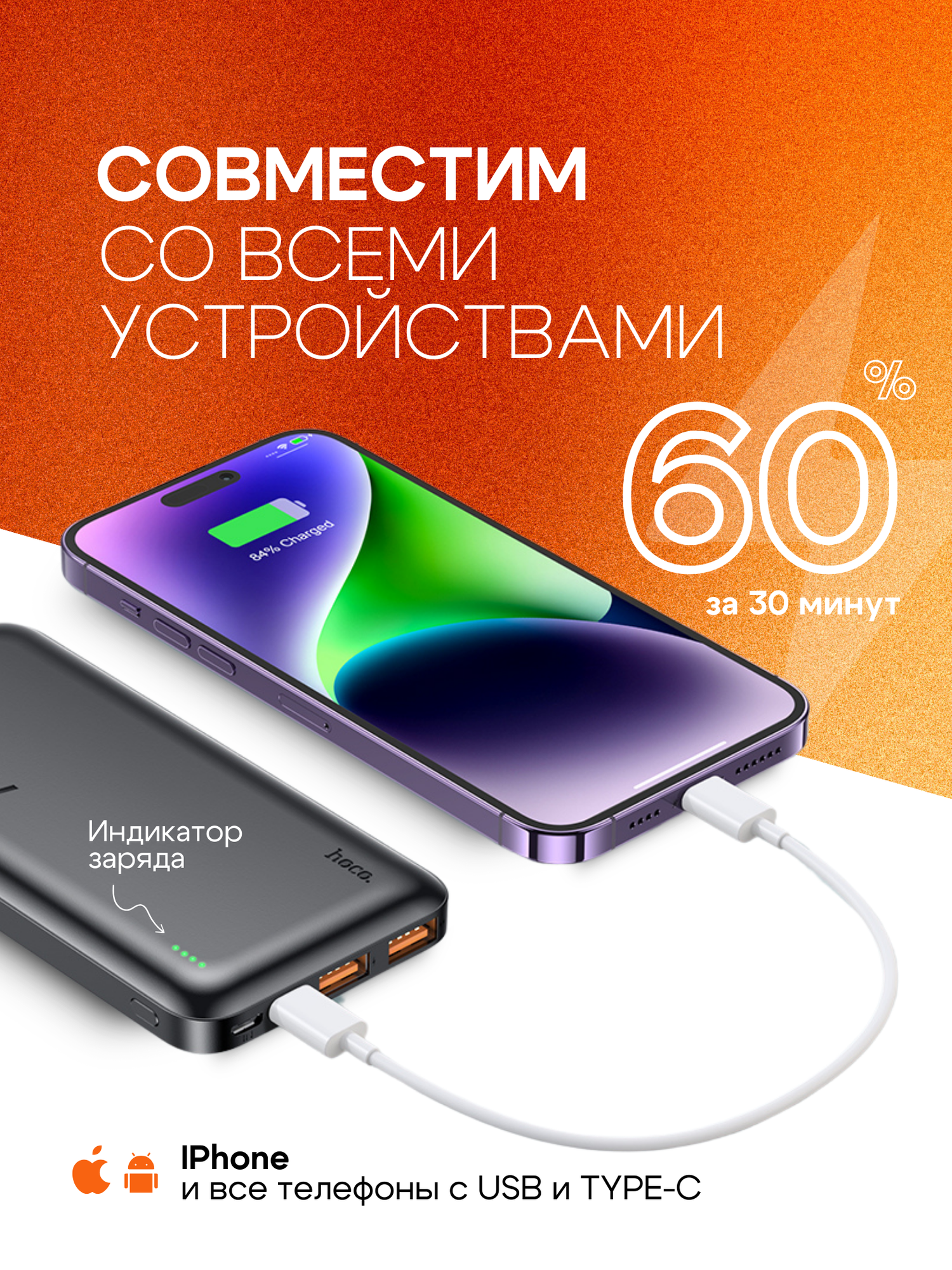 Внешний аккумулятор, Power Bank, Пауэрбанк, 80000, hoco, с быстрой зарядкой