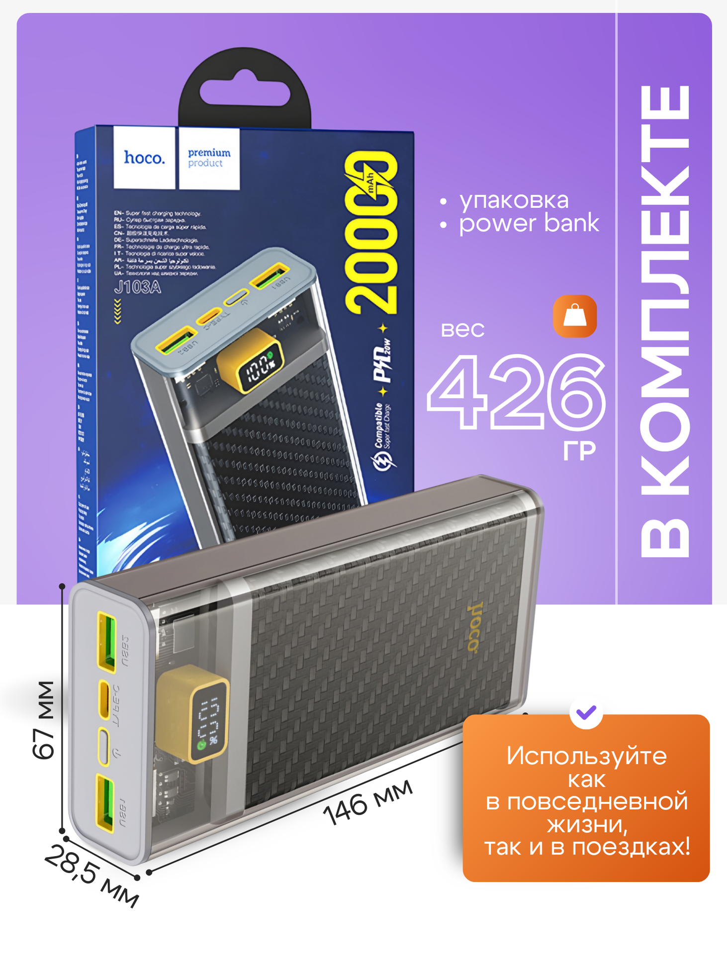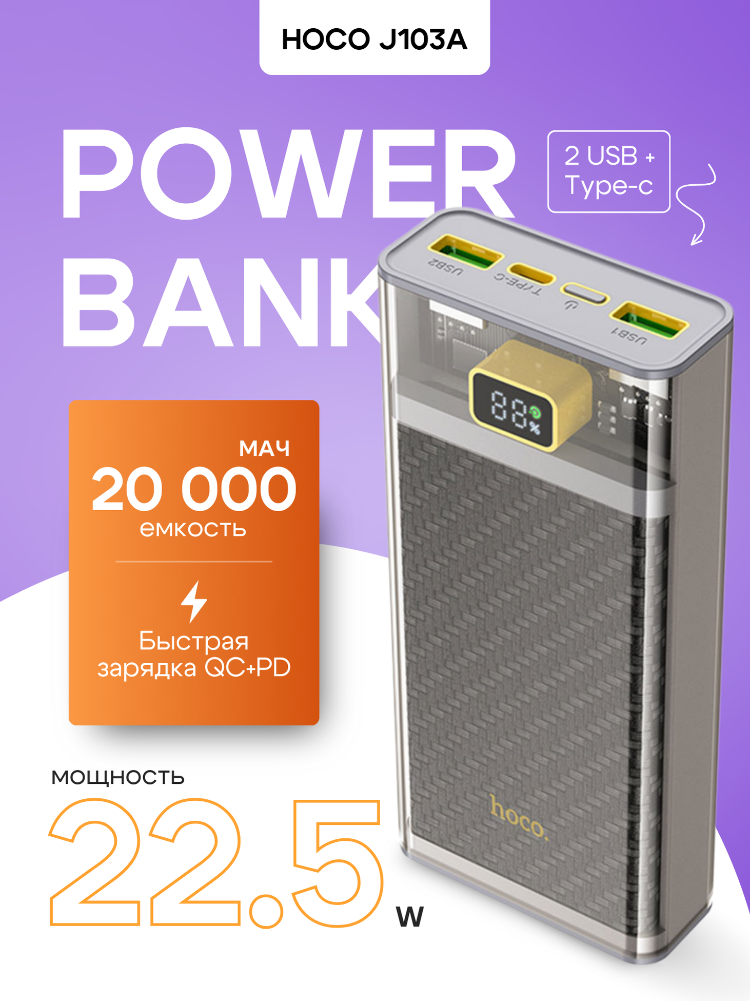Универсальный Доп. Аккумулятор 10000mAh, J136, HOCO, выход: 2 USB (22.5W)+1 PD (20W) с дисплеем, белый