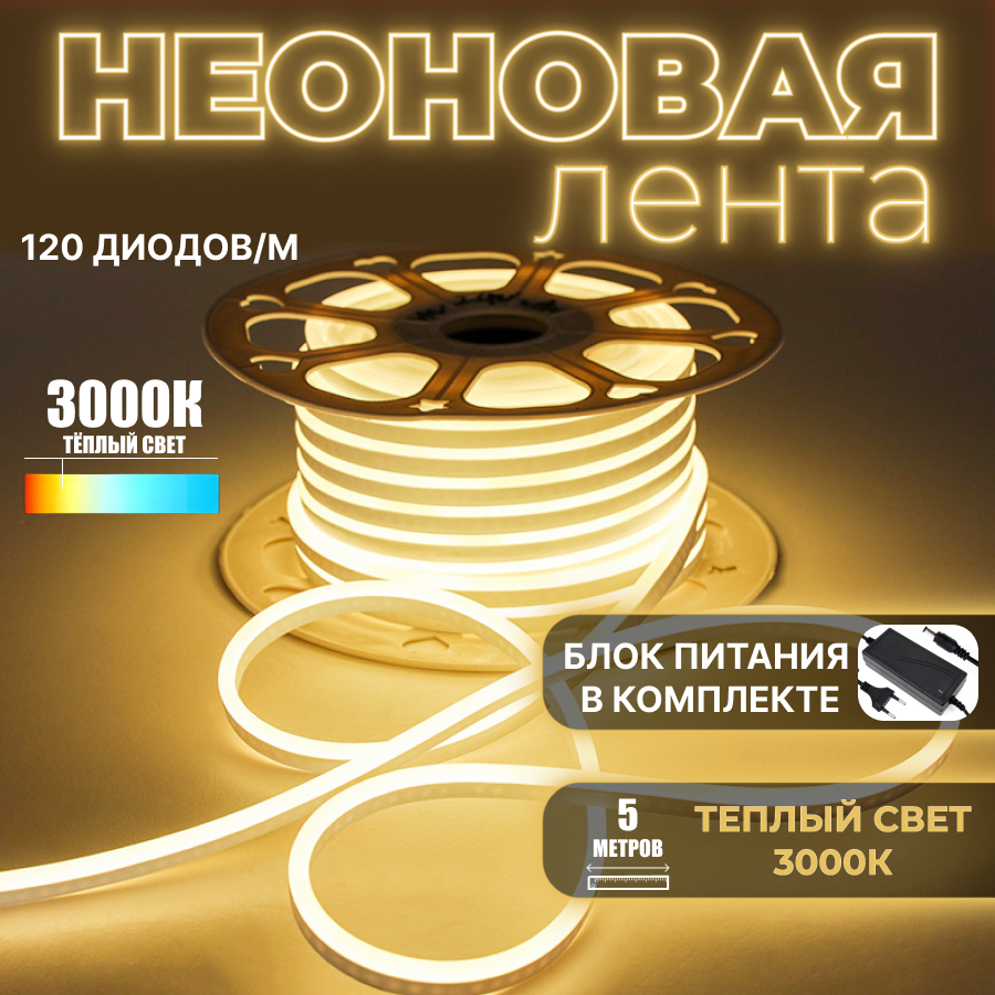 Купить Неоновая светодиодная лента, теплый белый свет, 5 метров, с блоком питания, гибкий неон
