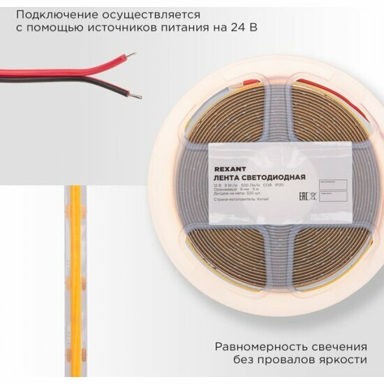 Светодиодная лента Rexant 12 В, 5 м, 8 мм, IP20, COB LED, 8 Вт/м, 320 LED/м, оранжевый интересное: