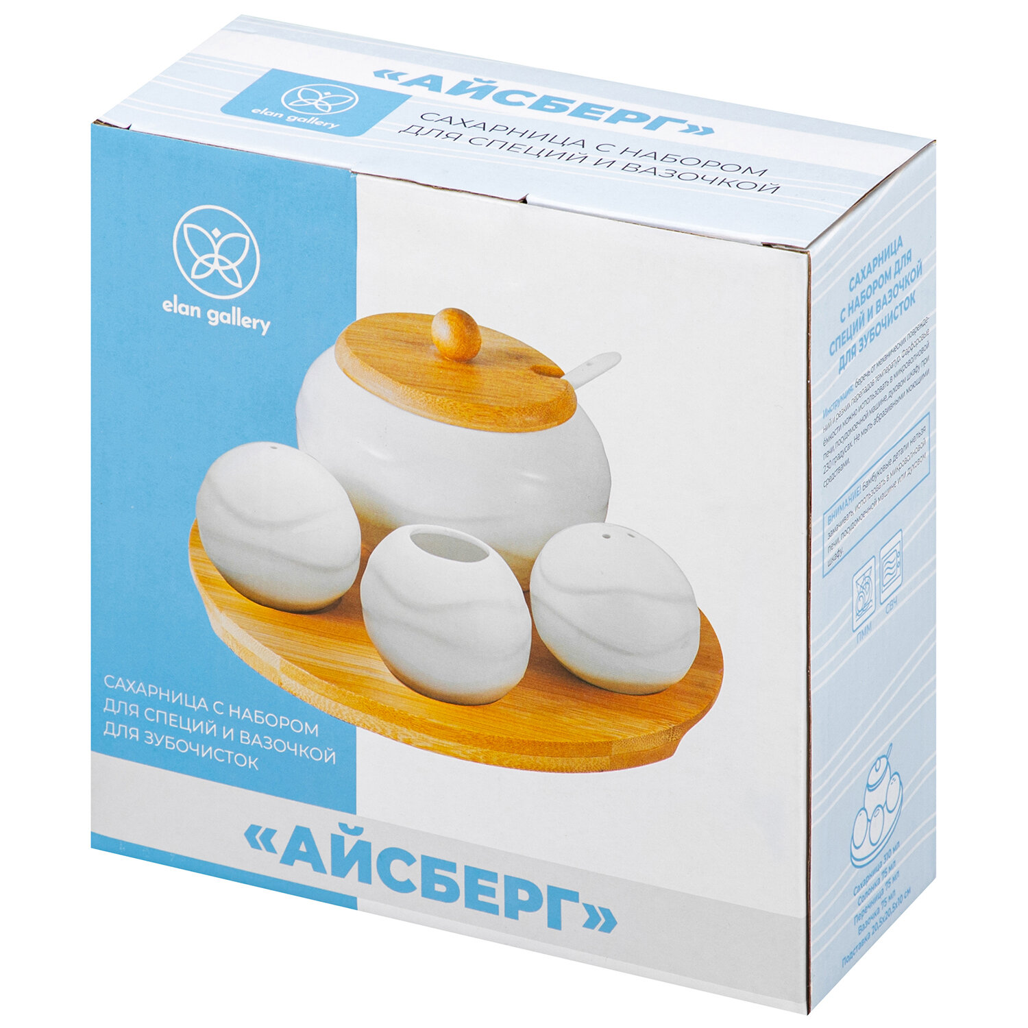 Купить Набор - Сахарница 310 мл Elan Gallery Айсберг волны с ложкой + вазочка под зубочистки + перечница + солонка на подст.