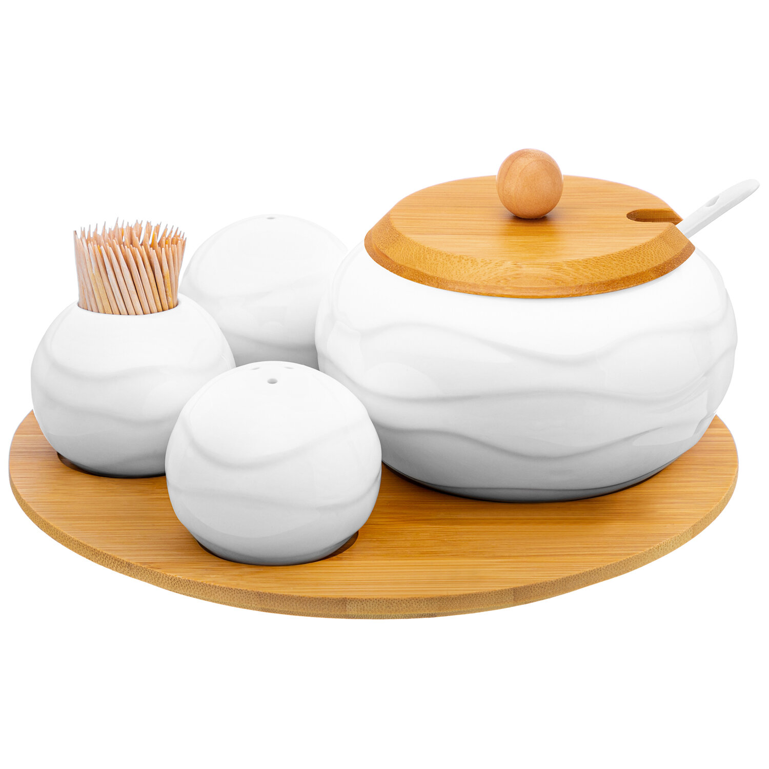 | Дополнительная информация | Набор 4 пр. 20,5*20,5*10 см. Сахарница 11*11*9,5 см, 310 мл с ложкой и с деревянной крышкой, высота без крышки - 6 см + Вазочка под зубочистки и набор для специй 2 предмета, 6*6*5 см 75 мл - каждая, на бамбук. подставке 20,5*20,5*1 см |