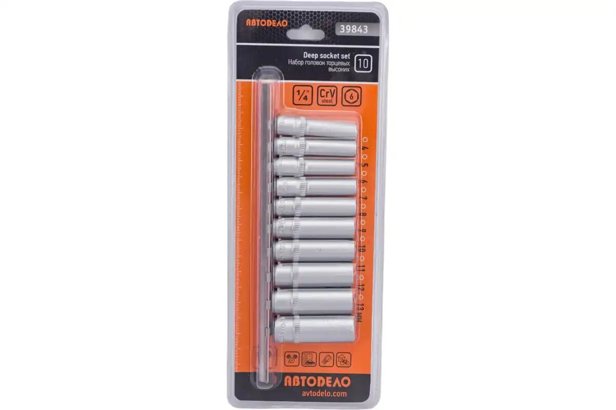 Набор головок АвтоDело шестигранных высоких 1/4 4-13мм 10 предметов 39843
