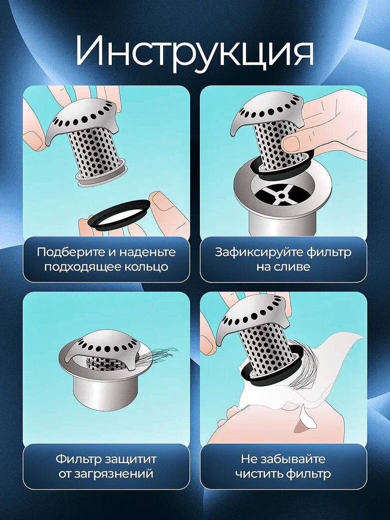| Комплектация | Фильтр для ванны улавливатель волос; 4 силиконовые прокладки диаметром от 3,7 до 4,5 см; прокладки для слива |