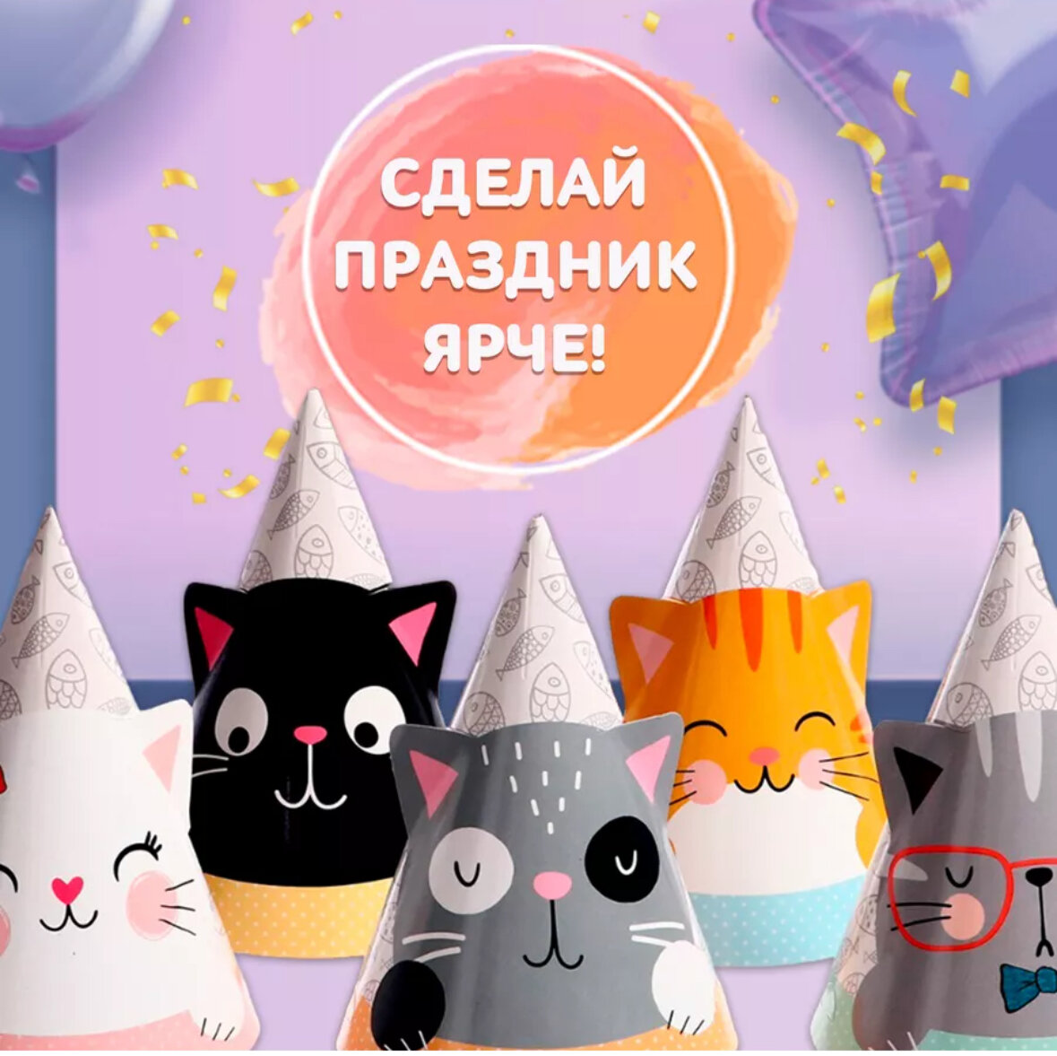 Колпаки Riota "Кошки с ушками", бумага, картон, для гостей, разноцветные, 6 шт интересное: