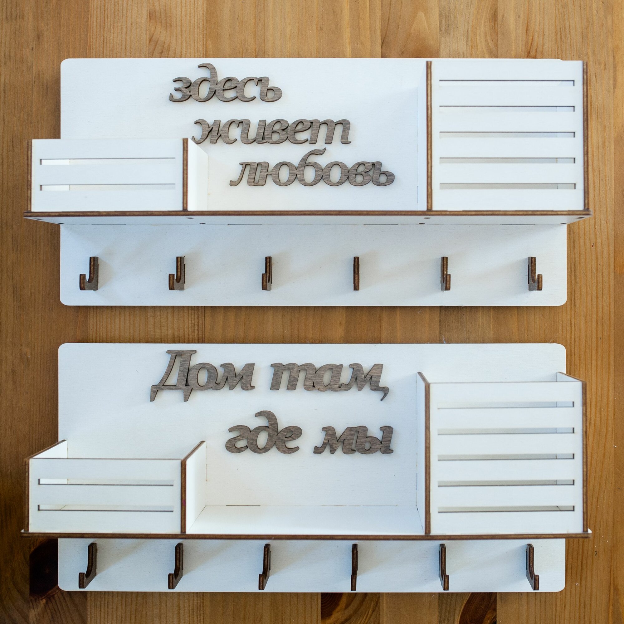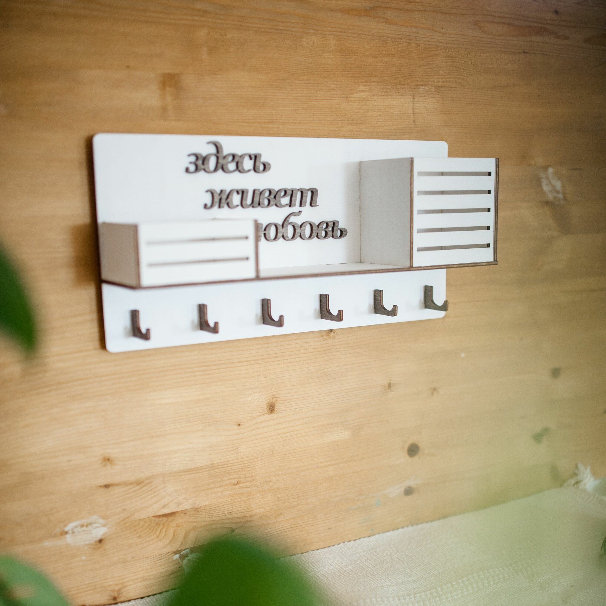 Ключница настенная декоративная большая белая Bezusoff 38 на 19 см с 6 крючками, полочкой и 2 отделениями. Здесь живет любовь.
