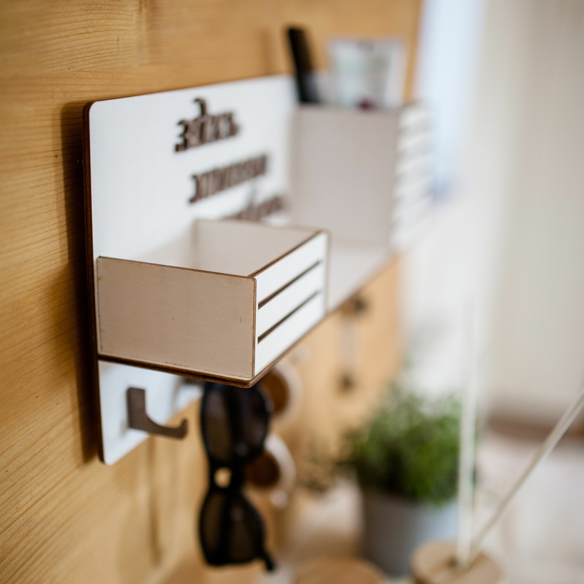 Ключница настенная декоративная большая Bezusoff 38 на 19 см с 6 крючками, полочкой и 2 отделениями. Белая без слов