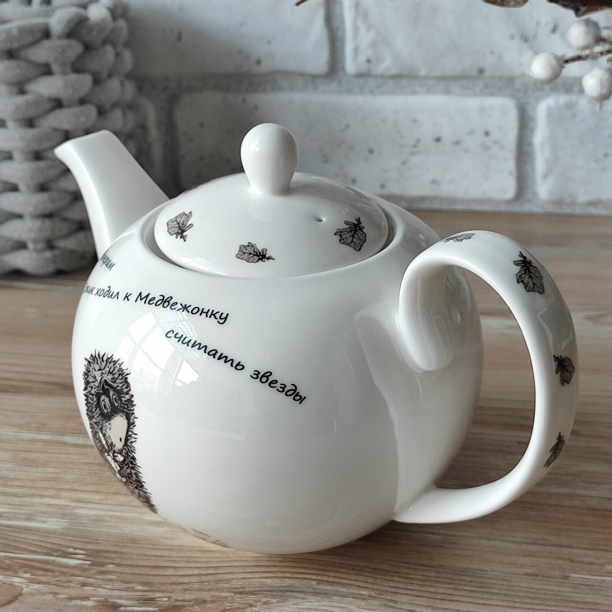 Чайник заварочный белый фарфоровый "Ежик в тумане" 1200 мл. Коралл