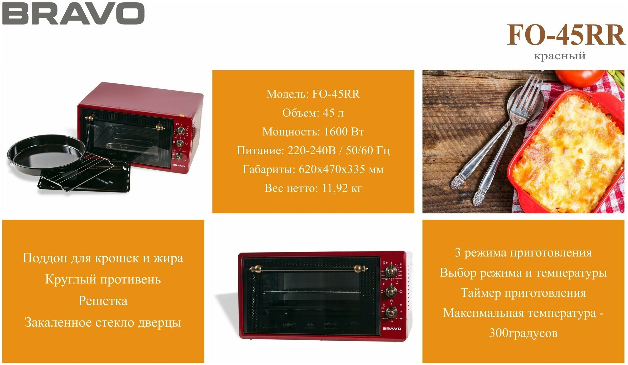 Печь электрическая BRAVO FO-45RR 45 л. красная , ручки ретро 1204566 интересное: