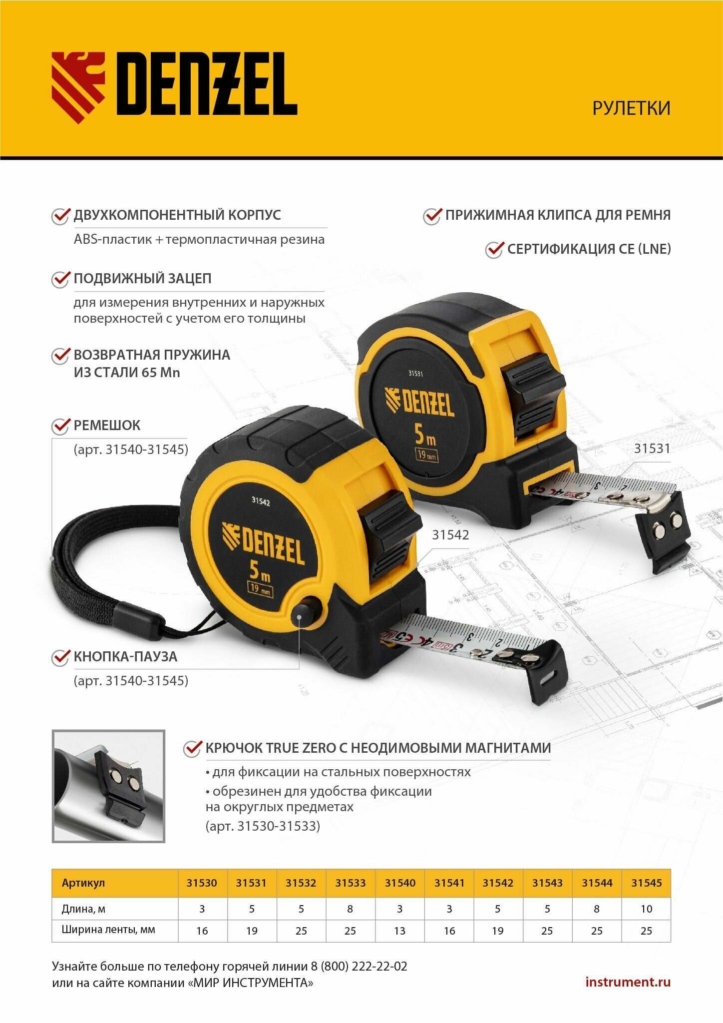 Рулетка Denzel 5м х 19ммдвухкомп. корпус, кнопка-пауза 31542 интересное: