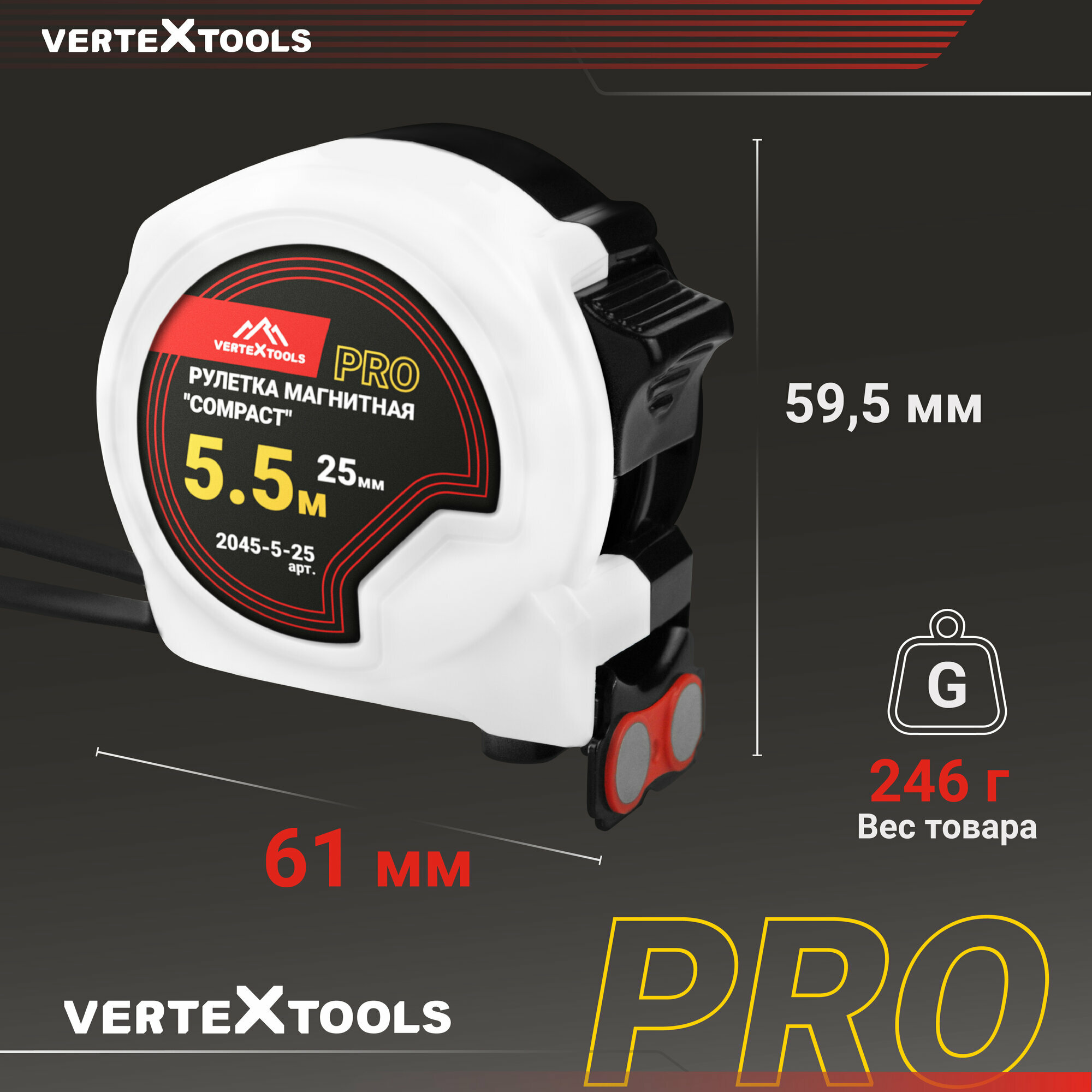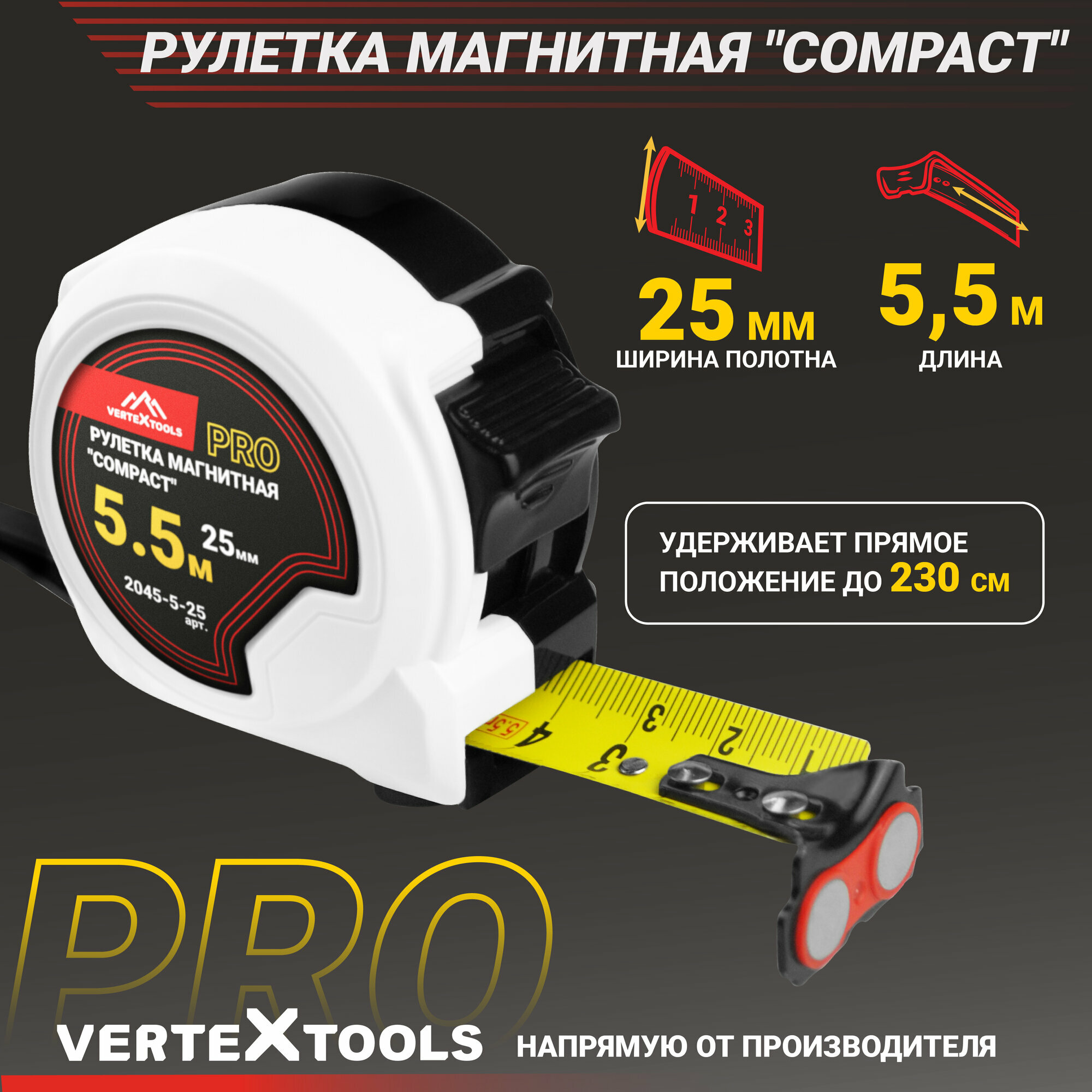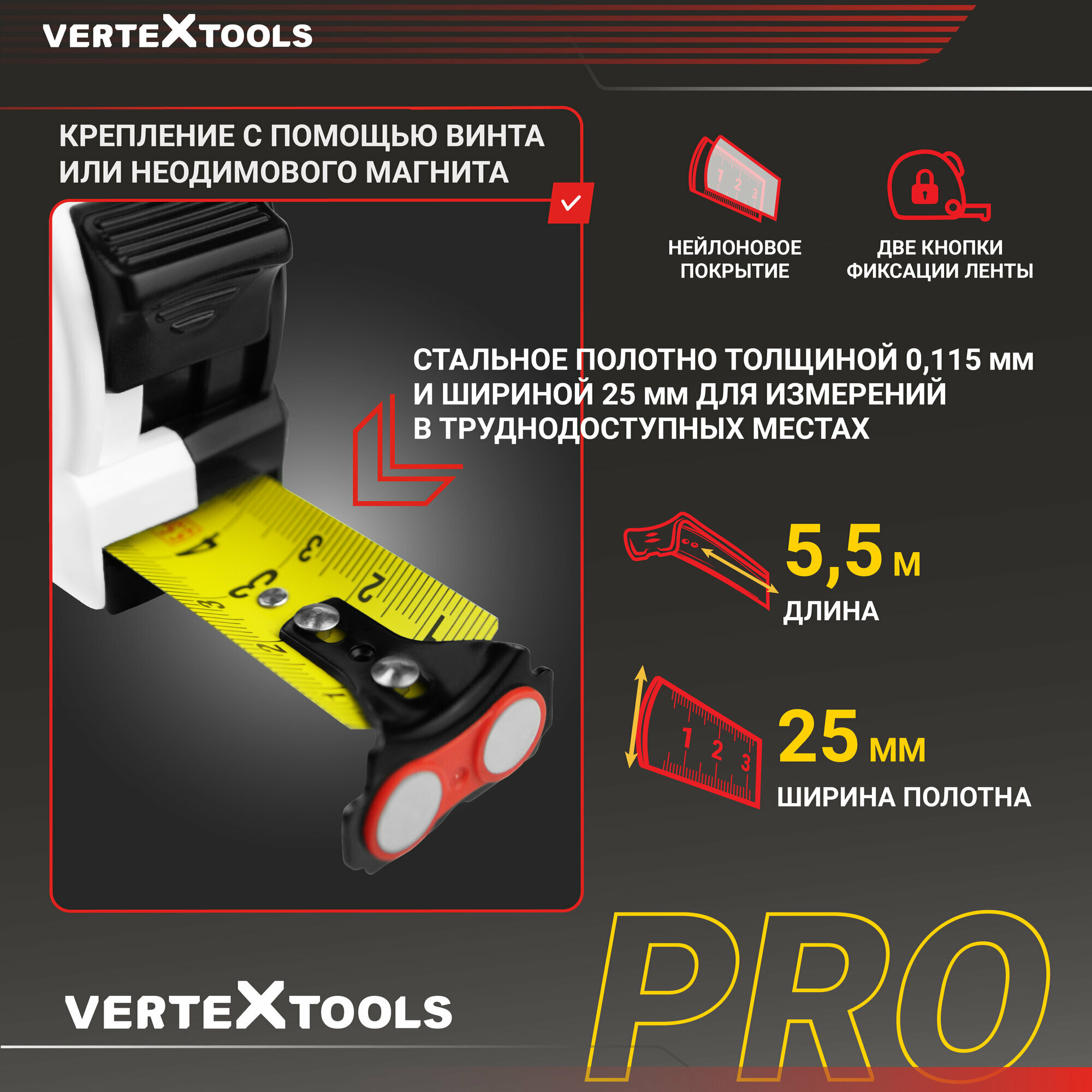 Купить Рулетка измерительная VertexTools COMPACT 5.5 м x 25 мм, магнит, нейлоновое покрытие, усиленный корпус