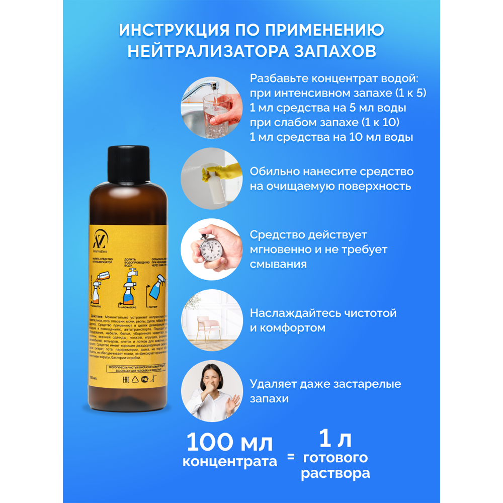 | Дополнительная информация | устраняет запах экскрементов, меток животных, слюней, рвоты, псины, разложений |