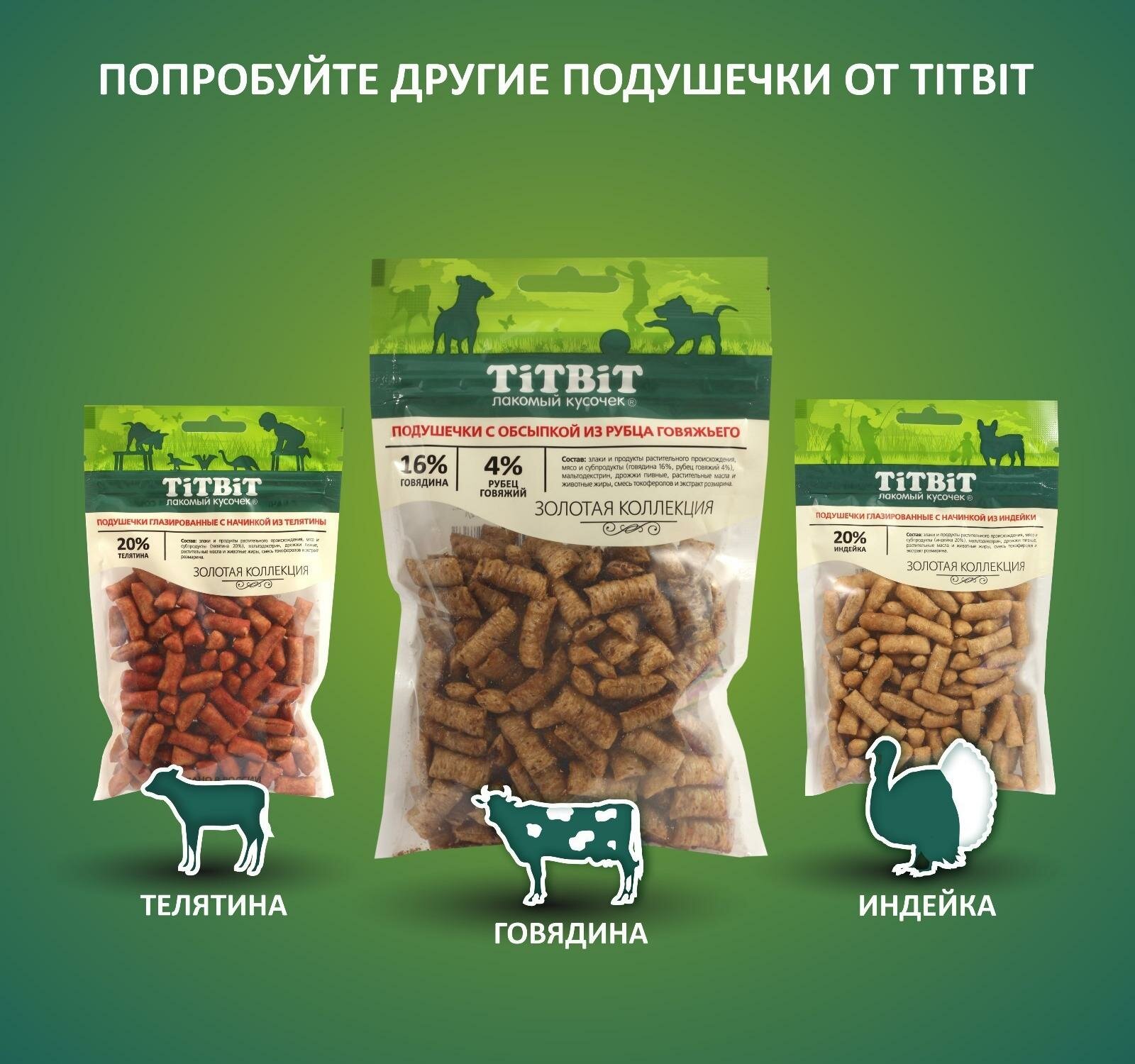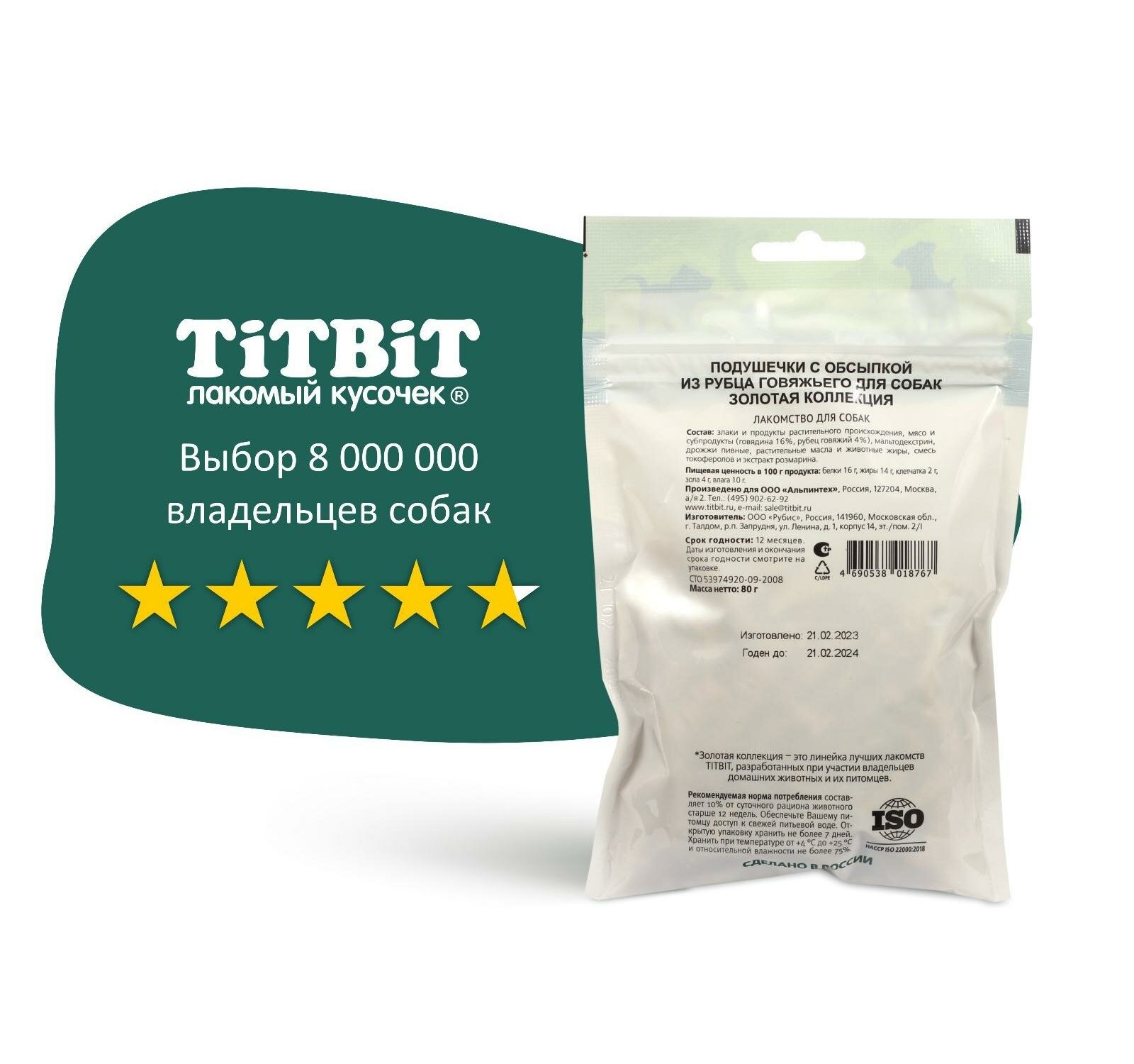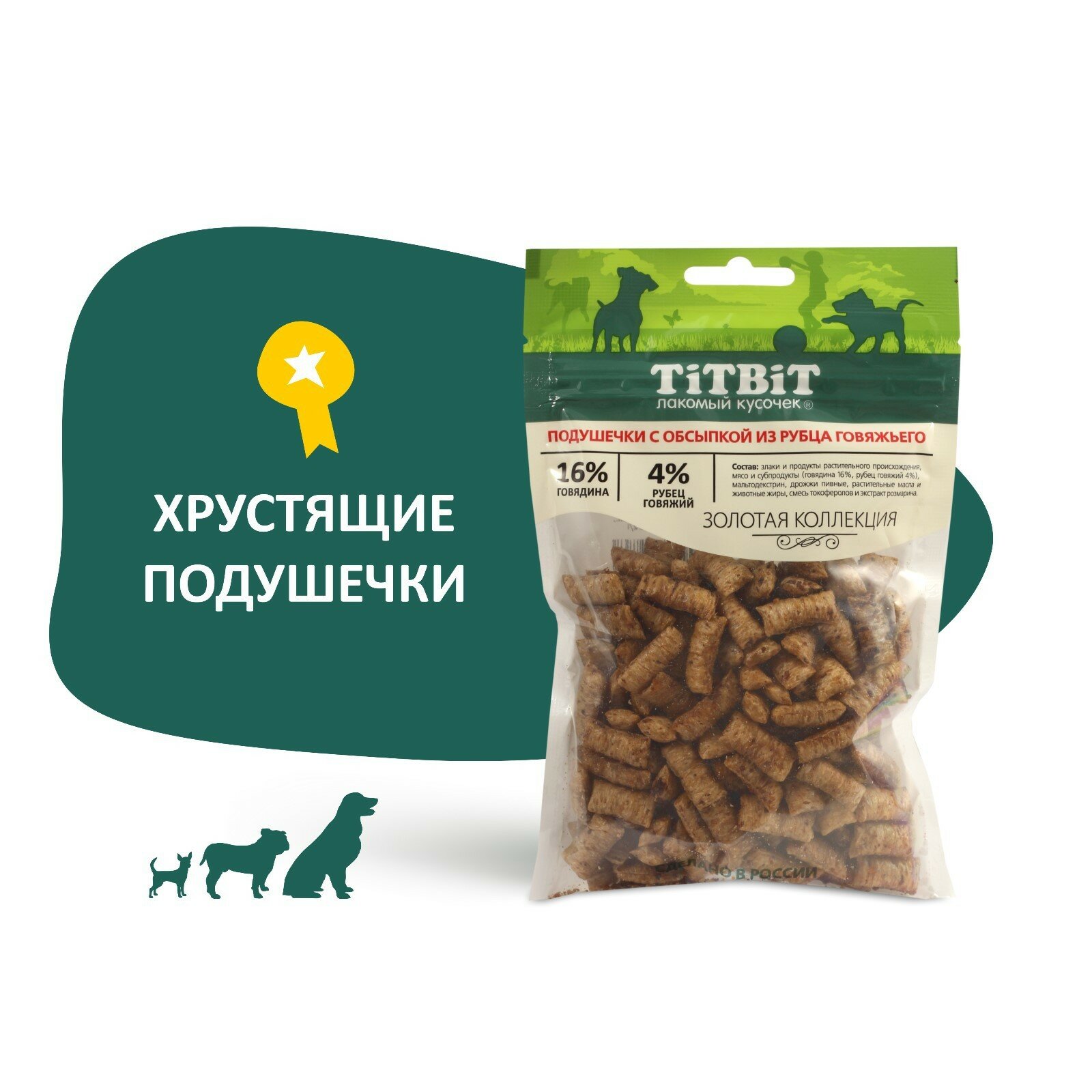 Купить Лакомство для собак золотая коллекция TitBit подушечки с обсыпкой из рубца говяжьего 80г 018767