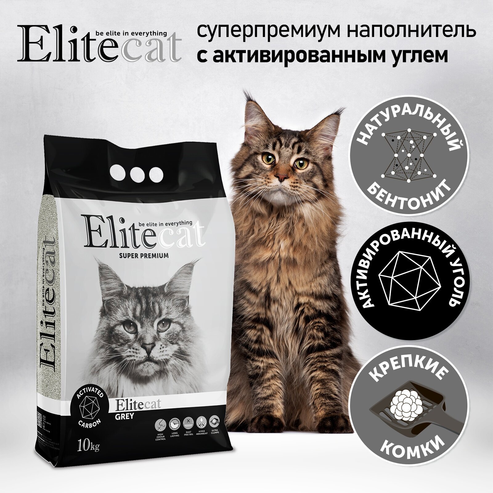 Наполнитель для кошачьего туалета комкующийся, с угольными гранулами EliteCat "Activated Carbon", глиняный, без отдушки, 6л