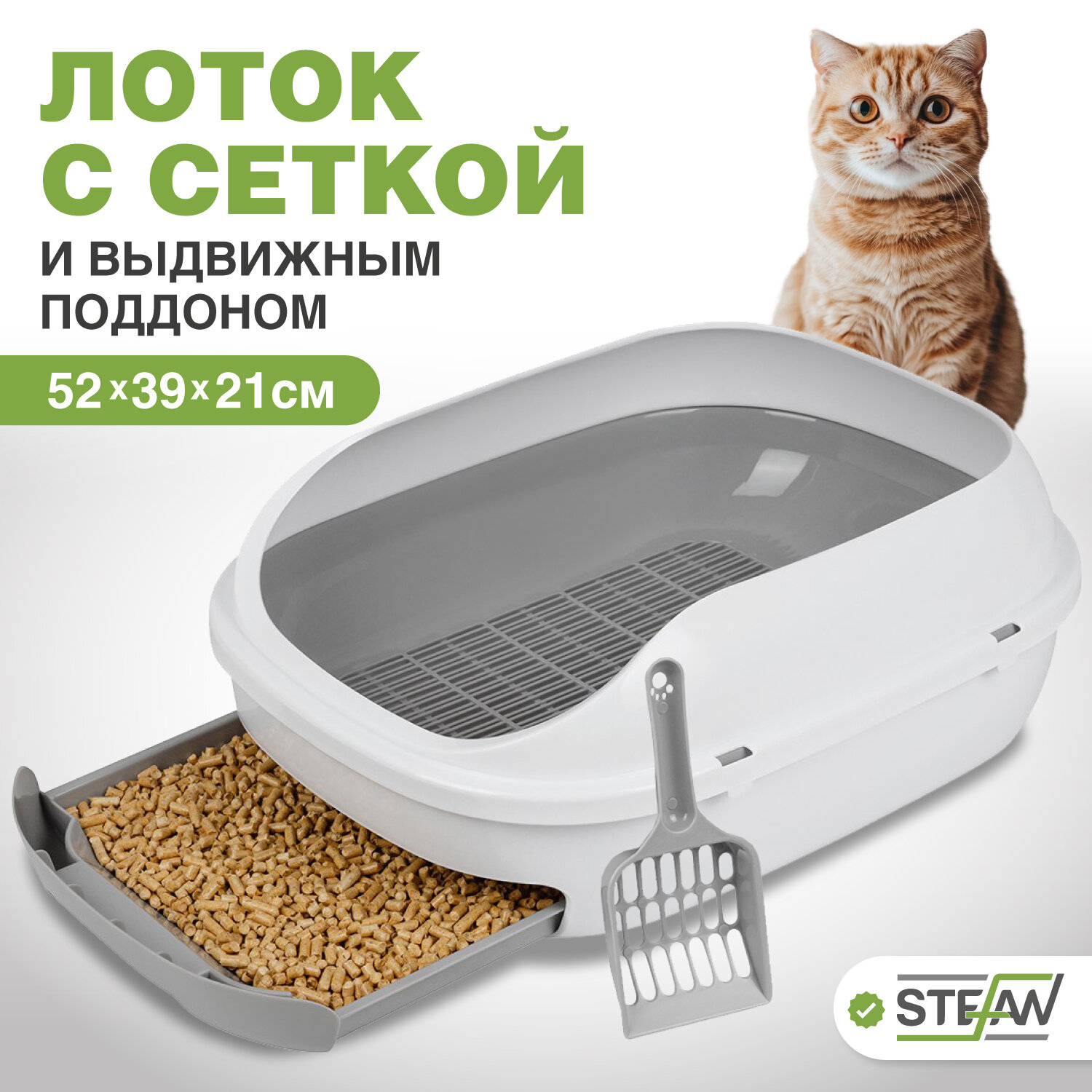 Лоток для кошек системный STEFAN (Штефан) с высокими бортами, сеткой и выдвижным поддоном, большой (L) 51х40х21, серый, BP2911
