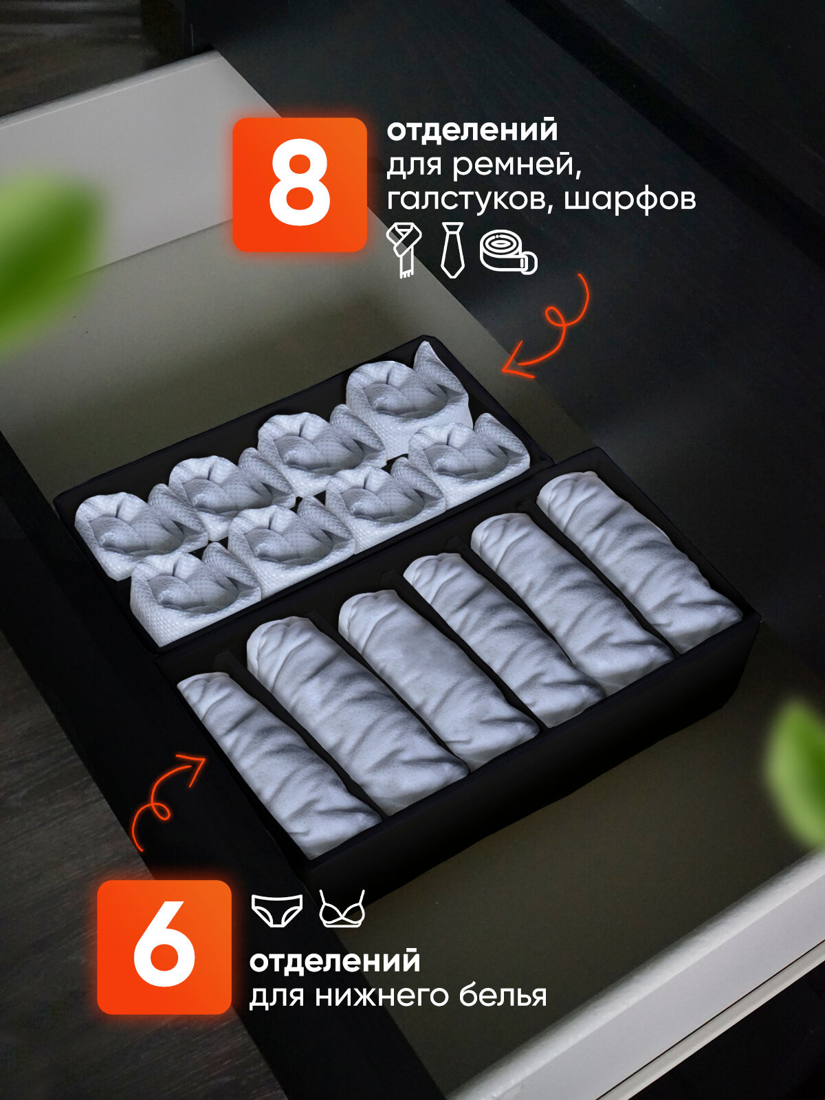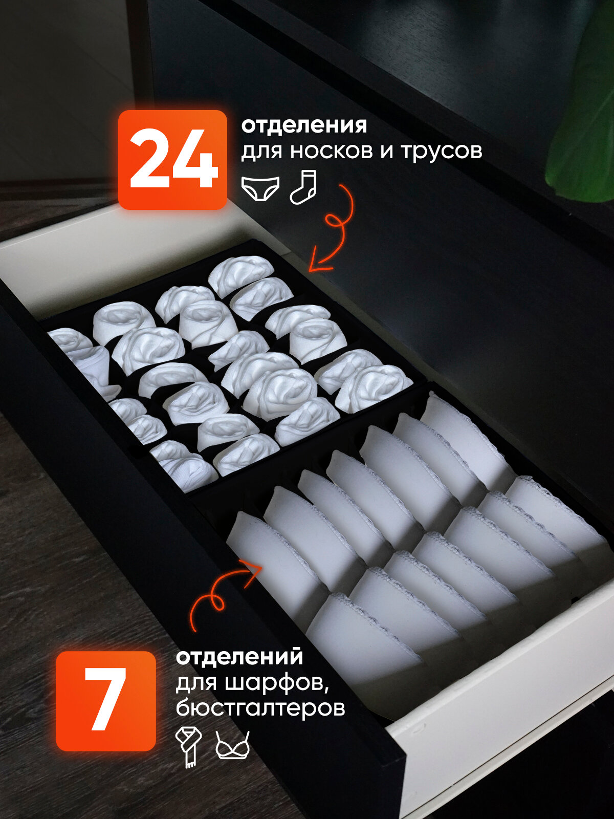 Органайзер для хранения вещей, нижнего белья, бюстгалтеров и носков в шкафу, складной, с разделителями, набор 4 шт, черный