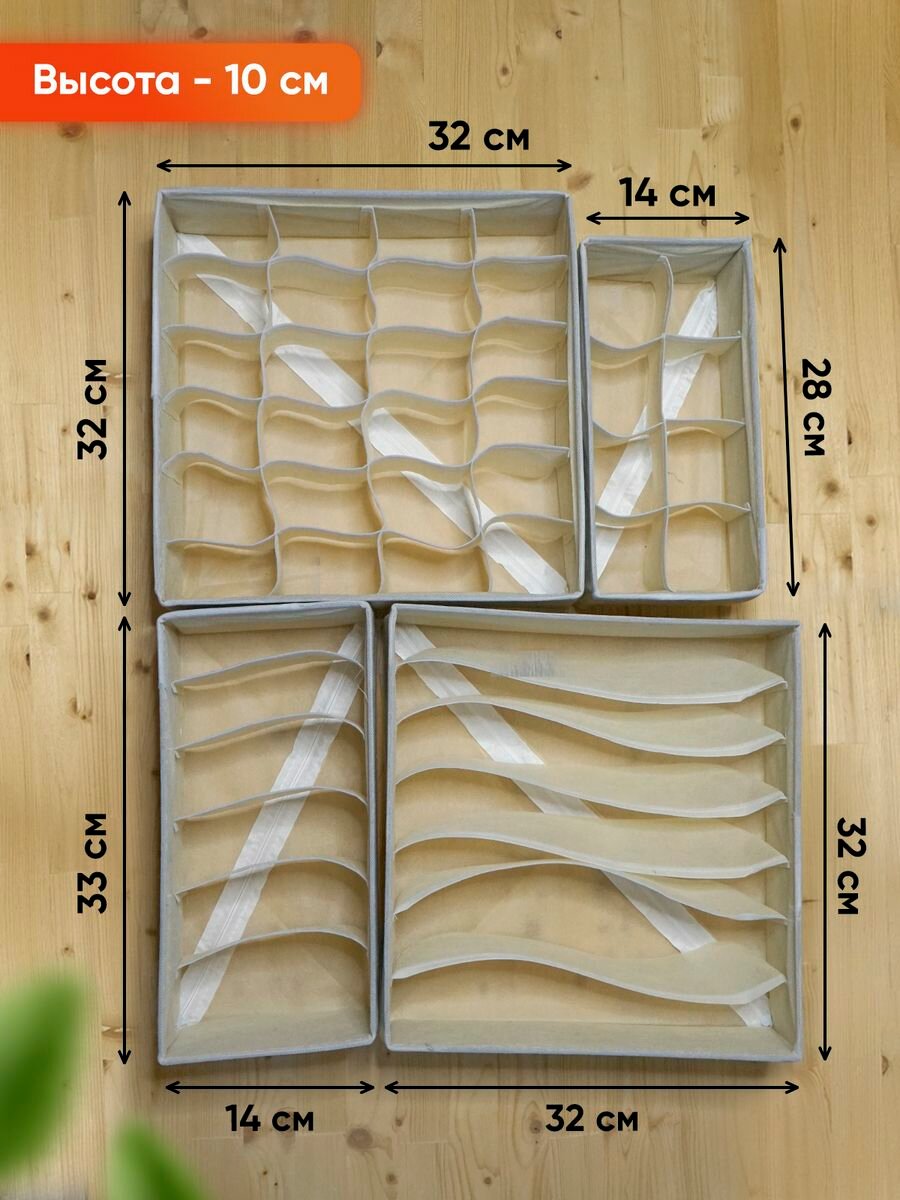 Органайзер для хранения вещей, нижнего белья, бюстгалтеров и носков в шкафу, складной, с разделителями, набор 4 шт, бежевый