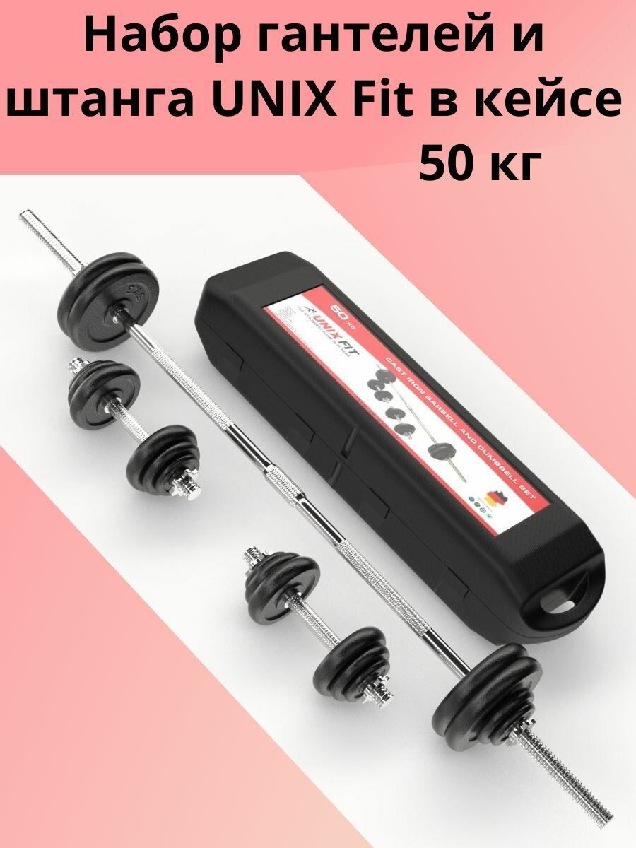 Набор гантелей UNIX Fit DBKITU50, с штангой, разборный, 50кг, в кейсе интересное: