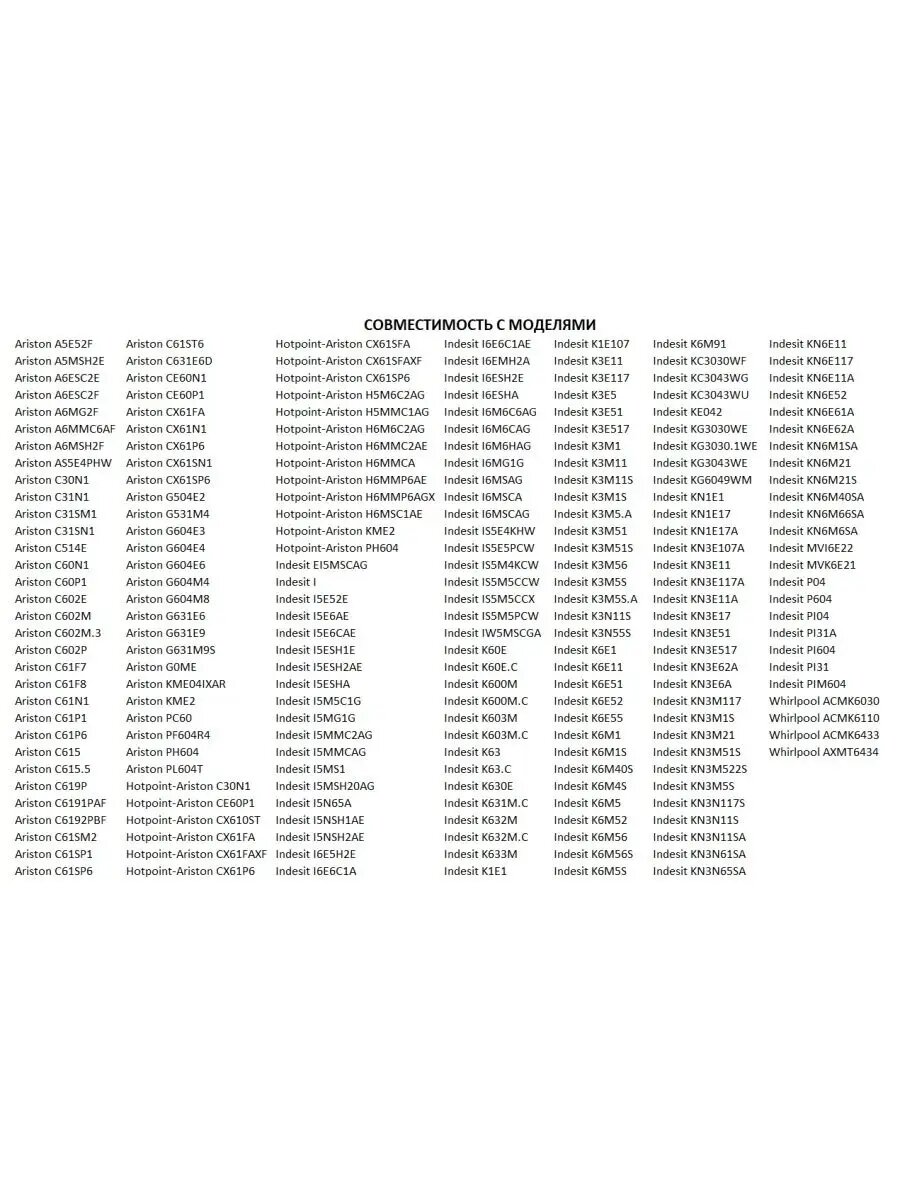 | Производитель совместимого устройства | AEG, ARDO, BEKO, Bauknecht, Bosch, DARINA, De Luxe, Electrolux, Flama, GEFEST, GRETA, Gorenje, Hansa, Hotpoint-Ariston, Indesit, Mora, Terra, Whirlpool, Zanussi, ЗВИ, Лада, Лысьва, Мечта |
