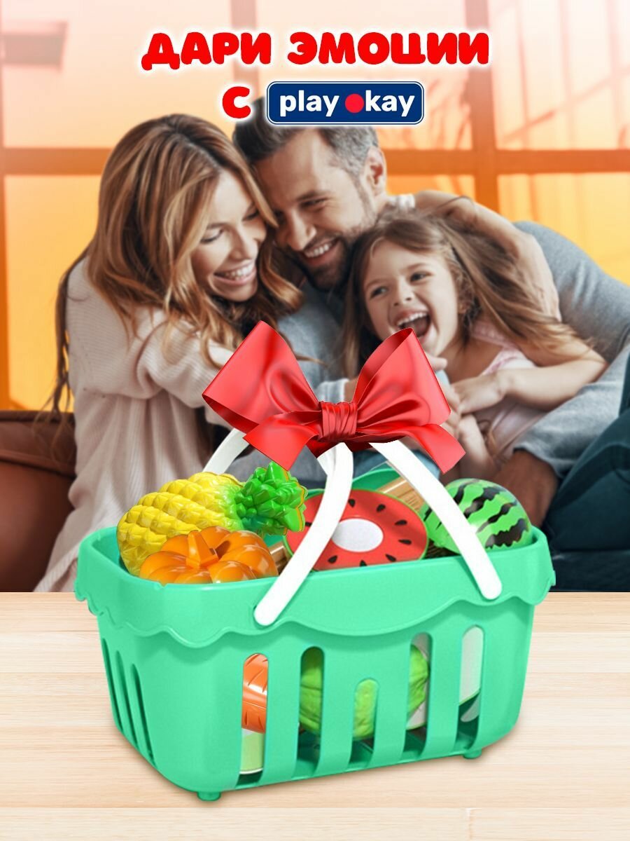 Купить Фрукты и овощи на липучке Play Okay, 32 предмета, игрушечные продукты с кухонными принадлежностями для нарезки еды и корзинкой, детские / Набор игровой