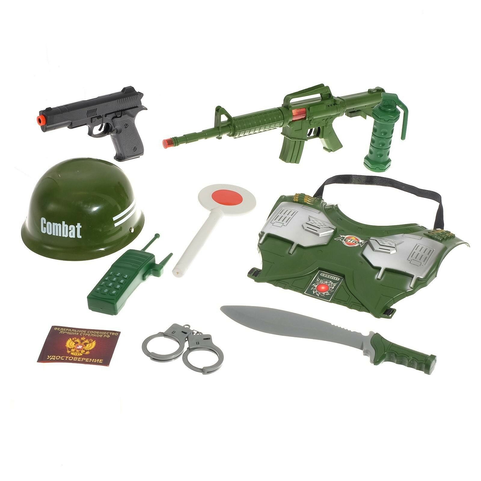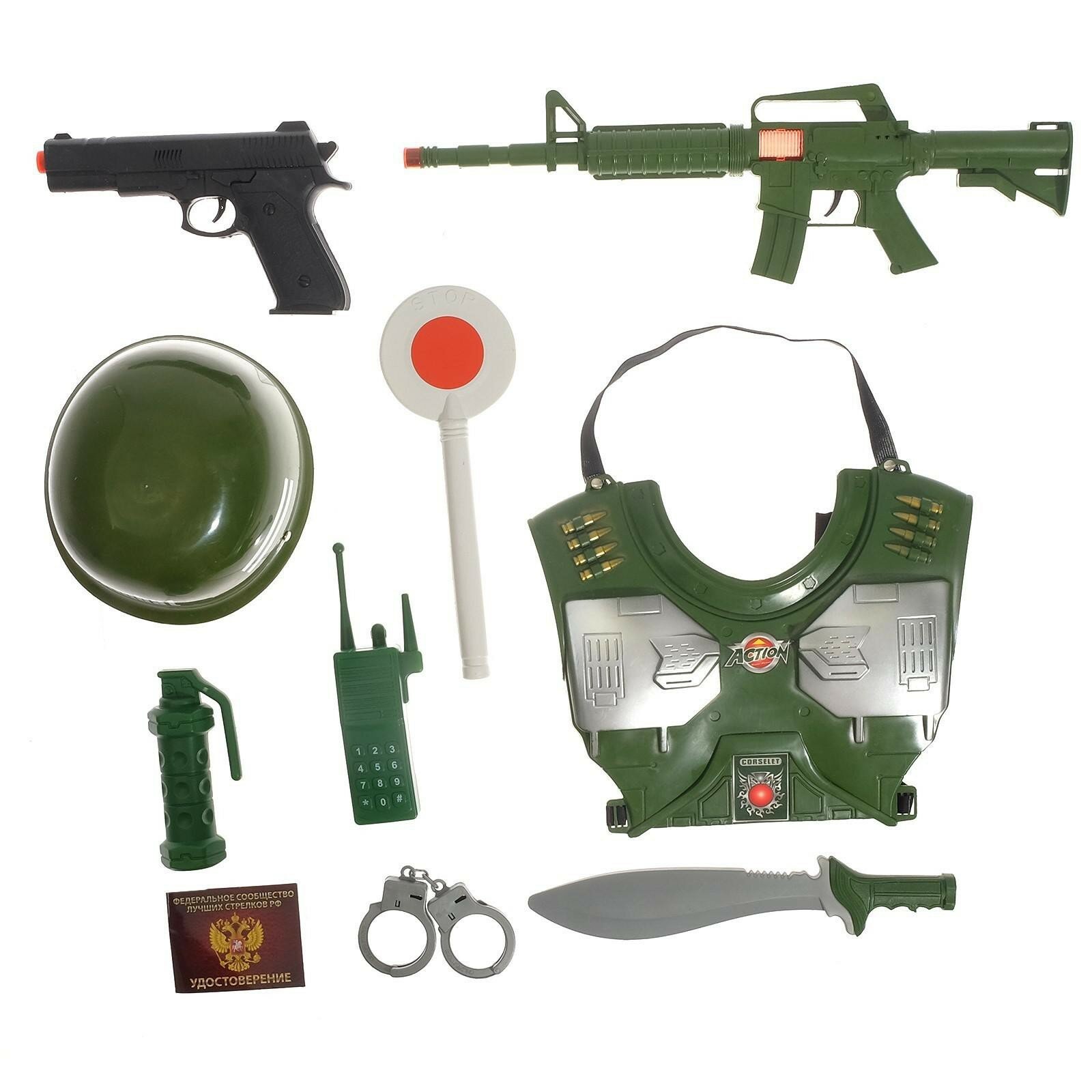Набор военного "Отряд А", 9 предметов: автомат, жилет, сигнальный жезл, пистолет, граната, рация, нож, каска, для детей от 3 лет, цвет зеленый