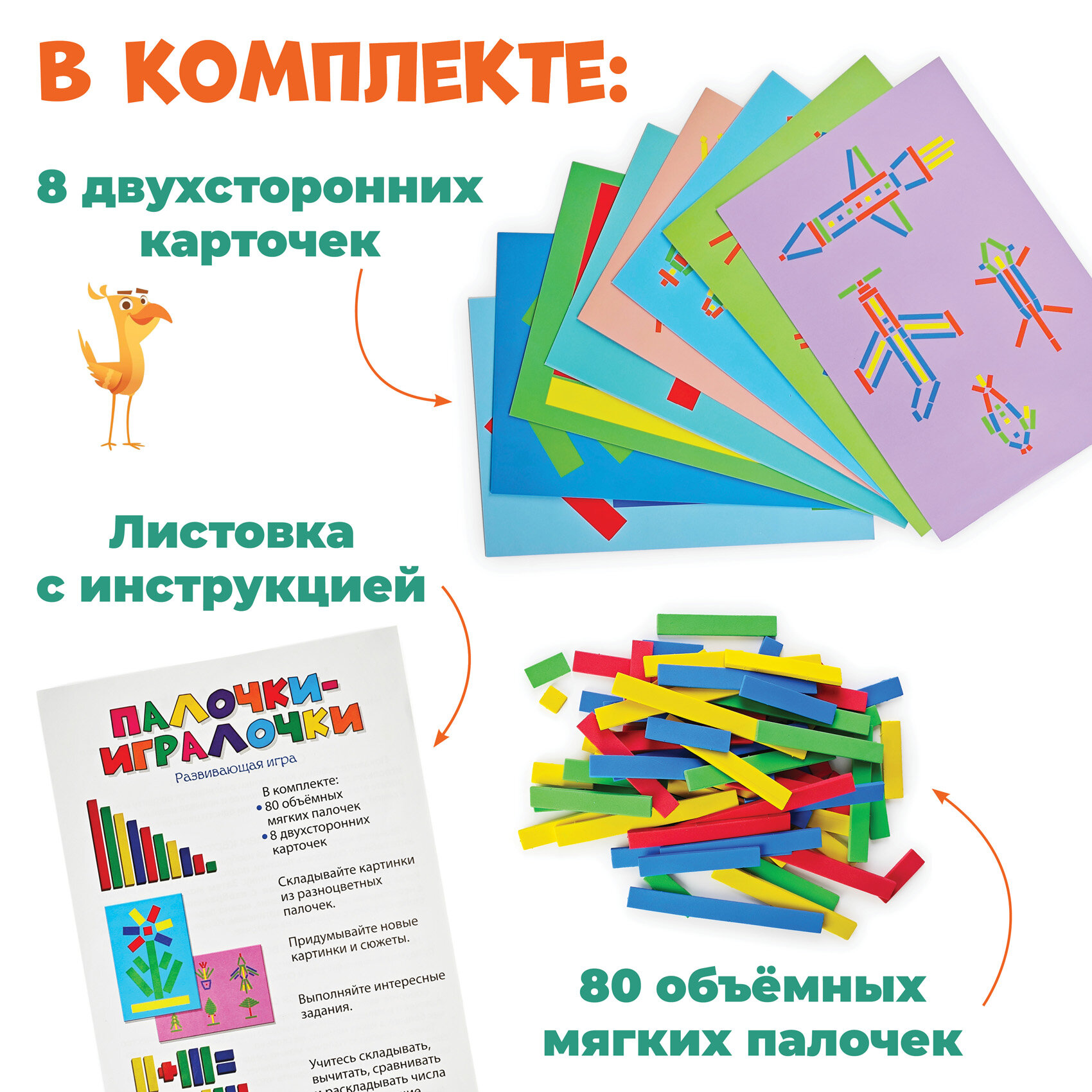 | Комплектация | 16 мягких объёмных деталей, 27 двухсторонних карточек, 54 задания |
