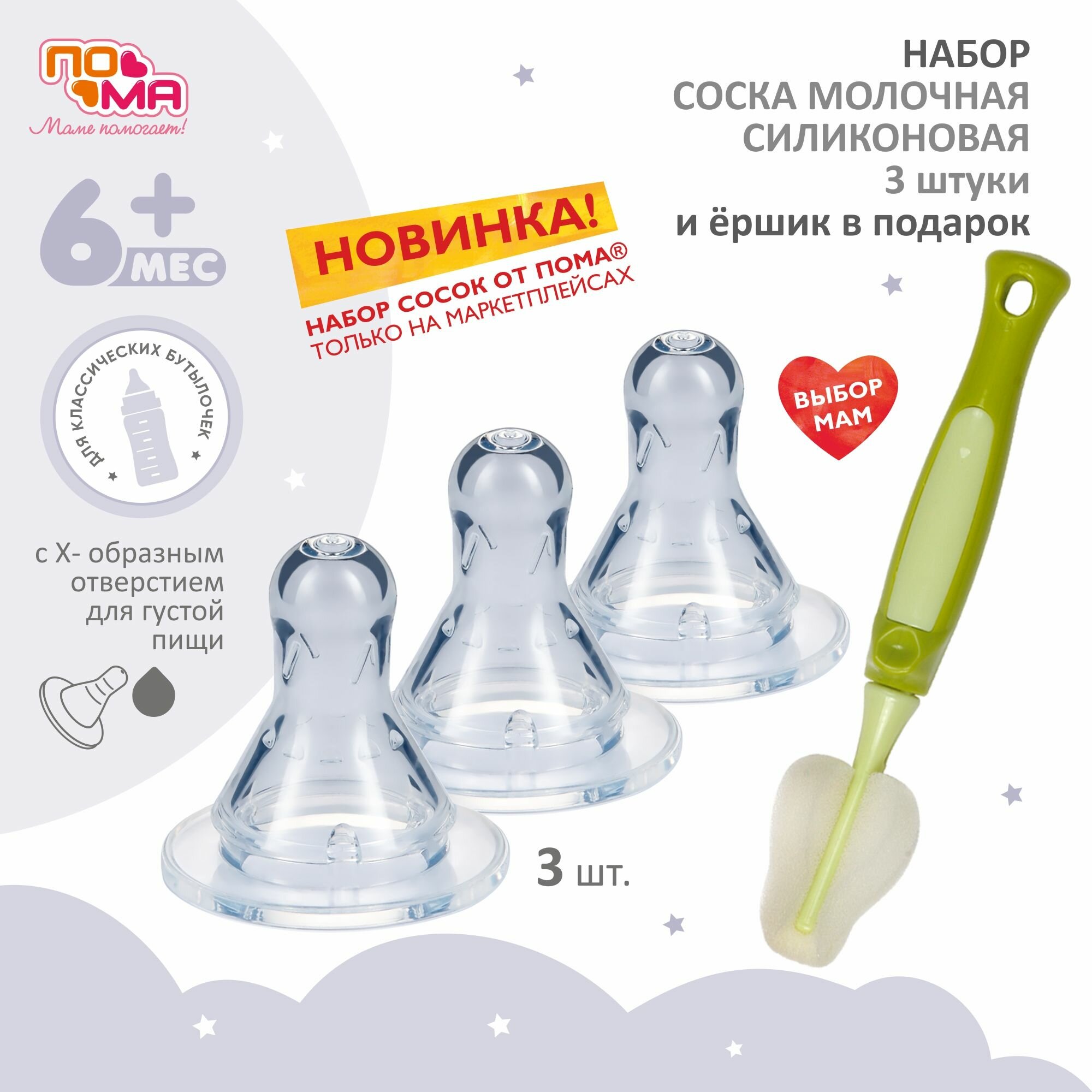 Набор сосок ПОМА, силикон, антиколиковый, с 6 мес, ёршиком в подарок