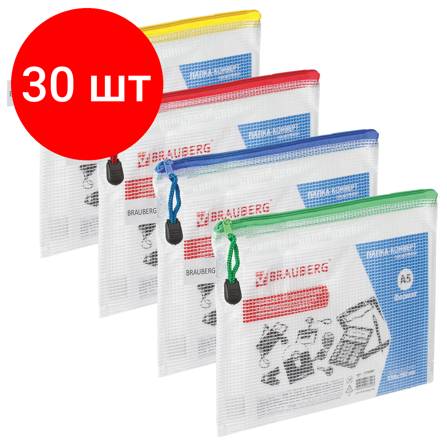 Купить Комплект 30 шт, Папка-конверт на молнии малый формат (238х180 мм) А5, молния ассорти, ПВХ, прозрачная, BRAUBERG "Segment", 223887