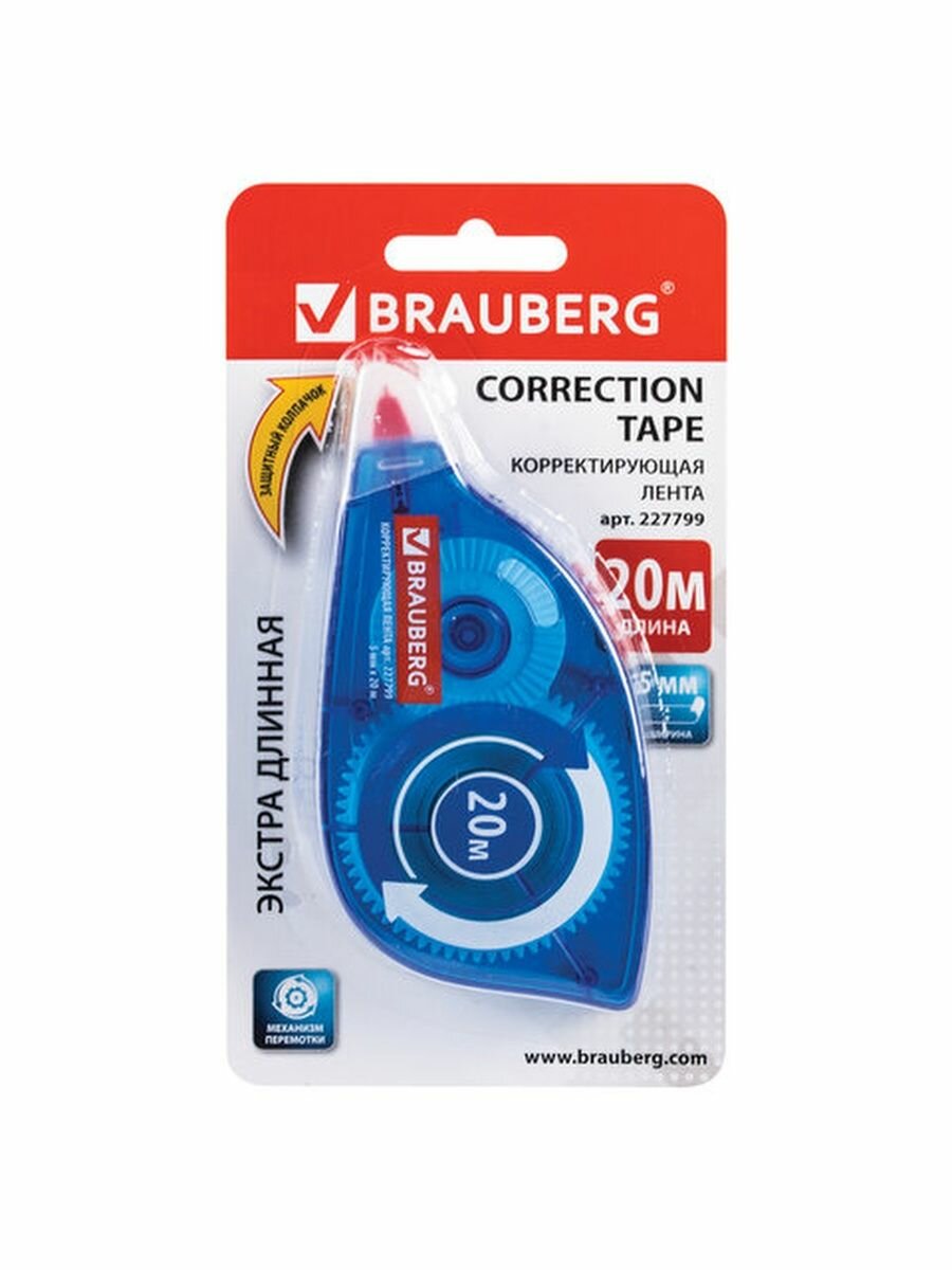 Корректирующая лента/корректор/шрих/замазка Brauberg 5 мм х 20 м, канцелярская, корпус синий, механизм перемотки
