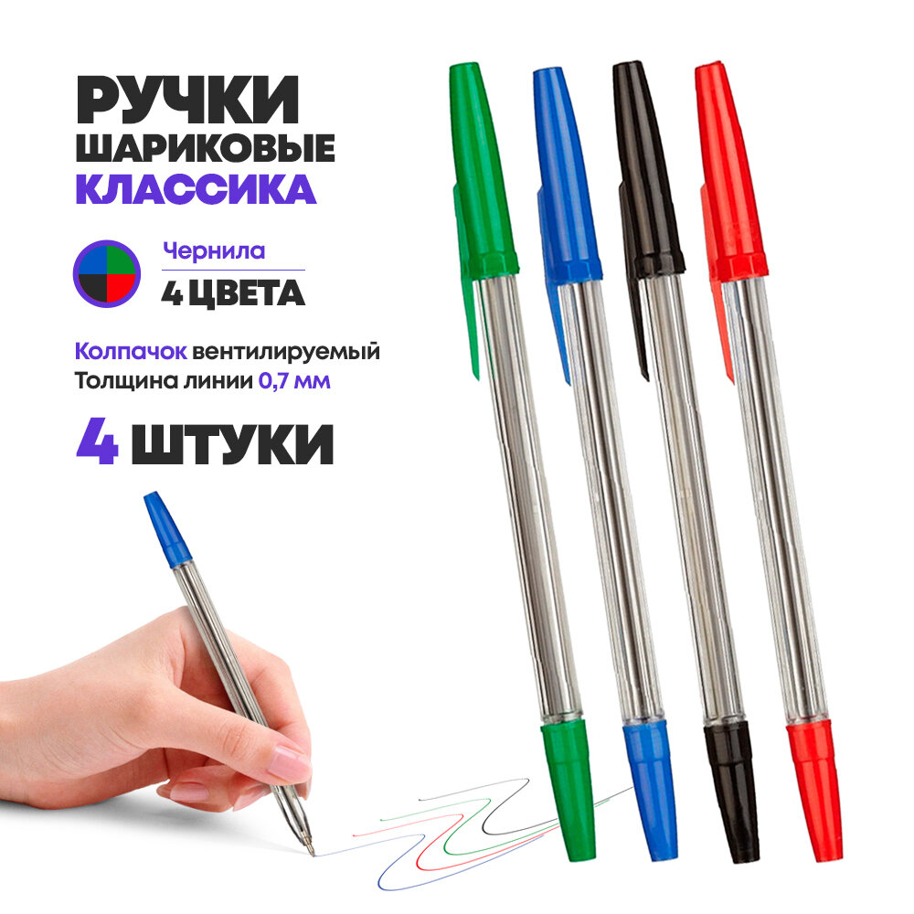 Набор шариковых ручек (4 цвета), сменный стержень, длина ручки 15,5 см, длина стержня 148 мм, толщина наконечника 1 мм, толщина линии 0,7 мм