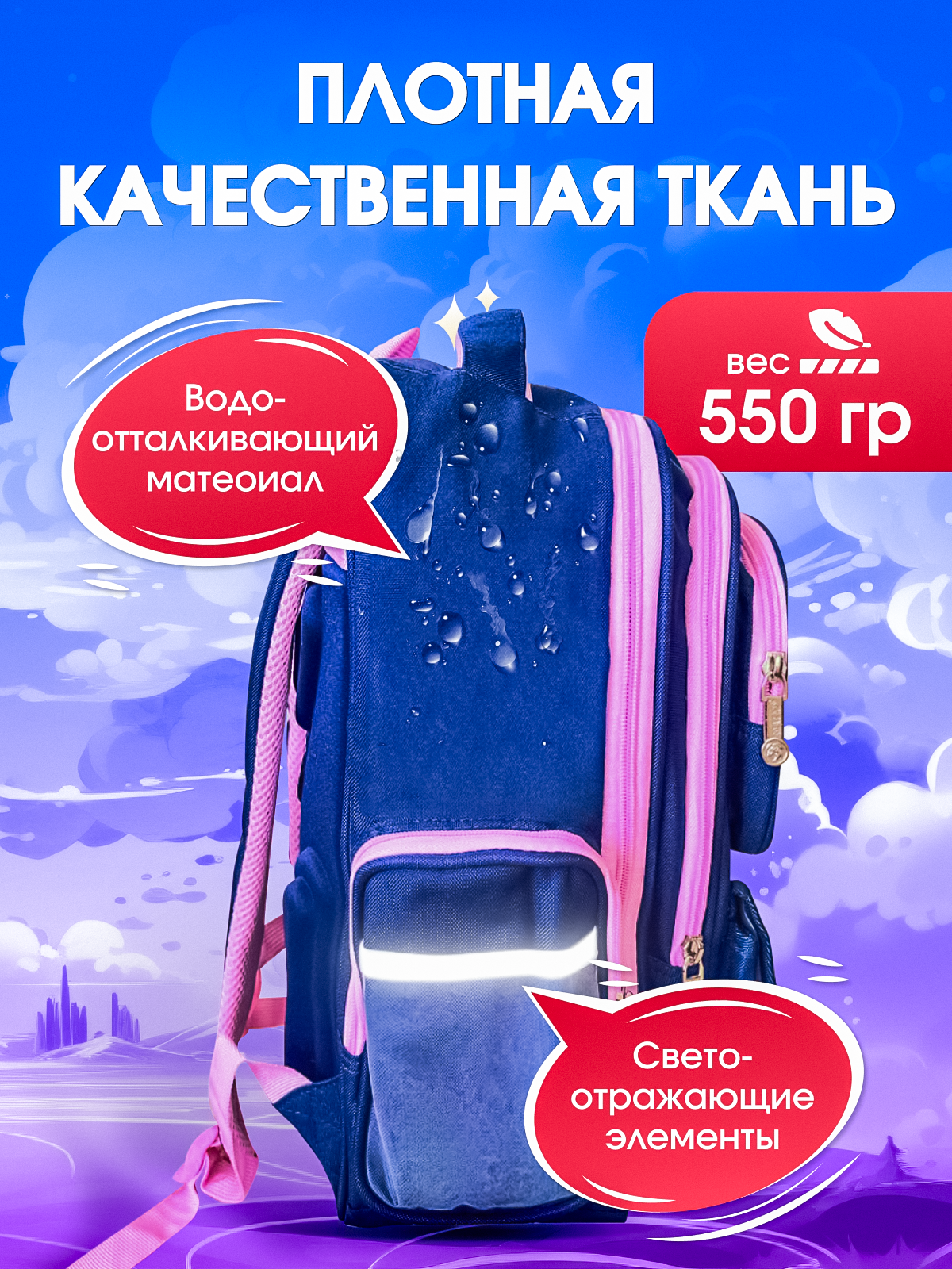 | Особенности | водоотталкивающая пропитка / грудная стяжка / ортопедический / разделитель в главном отделении / регулируемые лямки / ручка для переноски / светоотражающие элементы / эргономичная спинка |