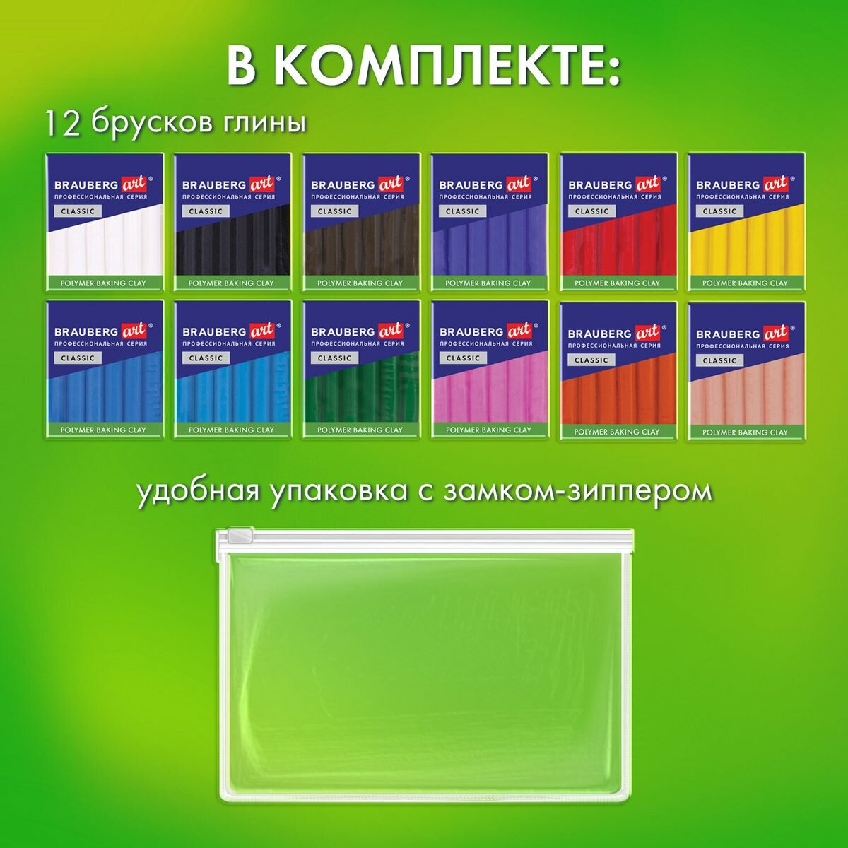 Полимерная запекаемая глина, набор 12 цветов по 20 гр, в пакете, Brauberg Art Classic 271162