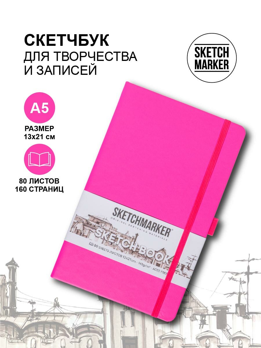 Скетчбук для рисования, блокнот для скетчинга SKETCHMARKER Sketchmarker 140г/кв.м 21*29.7см 80л твердая обложка. цвет Неоновая фуксия