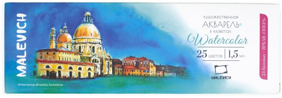 | Комплектация | В составе 25 цветов: белила титановые, лимонная, желтая, оранжево-желтая, оранжевая, охра желтая, красная темная, алая, опера, розовая, фиолетово-розовая, фиолетовая, голубая ФЦ, церулеум, индантреновая синяя, ультрамарин темный, индиго, бирюзовая, зеленая ФЦ, травяная зеленая, оливковая, оксид хрома, сиена жженая, умбра жженая, черная. |