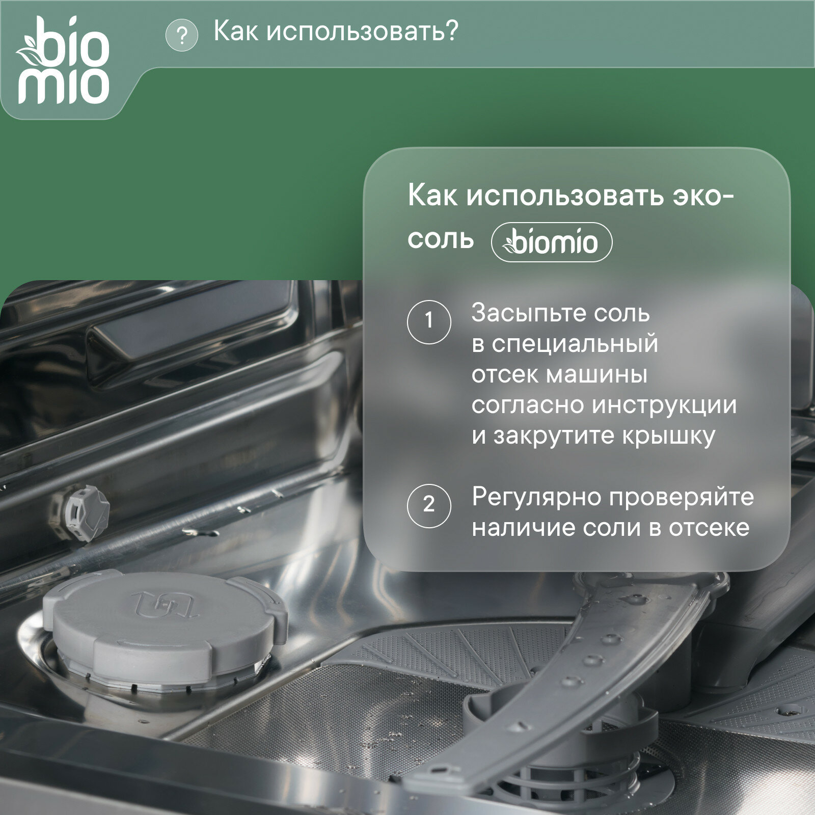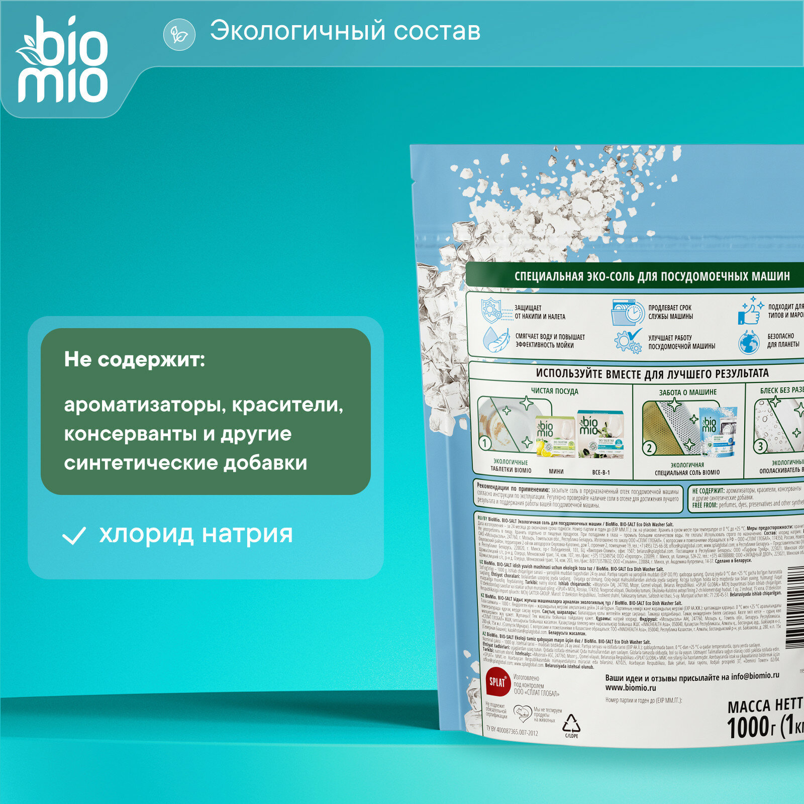| Дополнительная информация | рекомендации по применению: засыпьте соль в предназначенный отсек посудомоечной машины согласно инструкции по эксплуатации; регулярно проверяйте наличие соли в отсеке для достижения лучшего результата и поддержания работы вашей посудомоечной машины; для наилучших результатов используйте средство вместе с моющими средствами BioMio |
