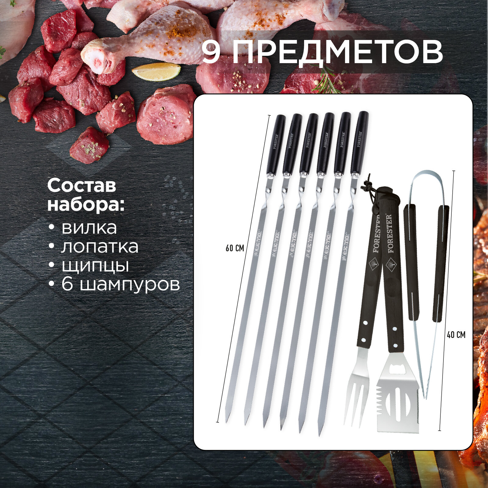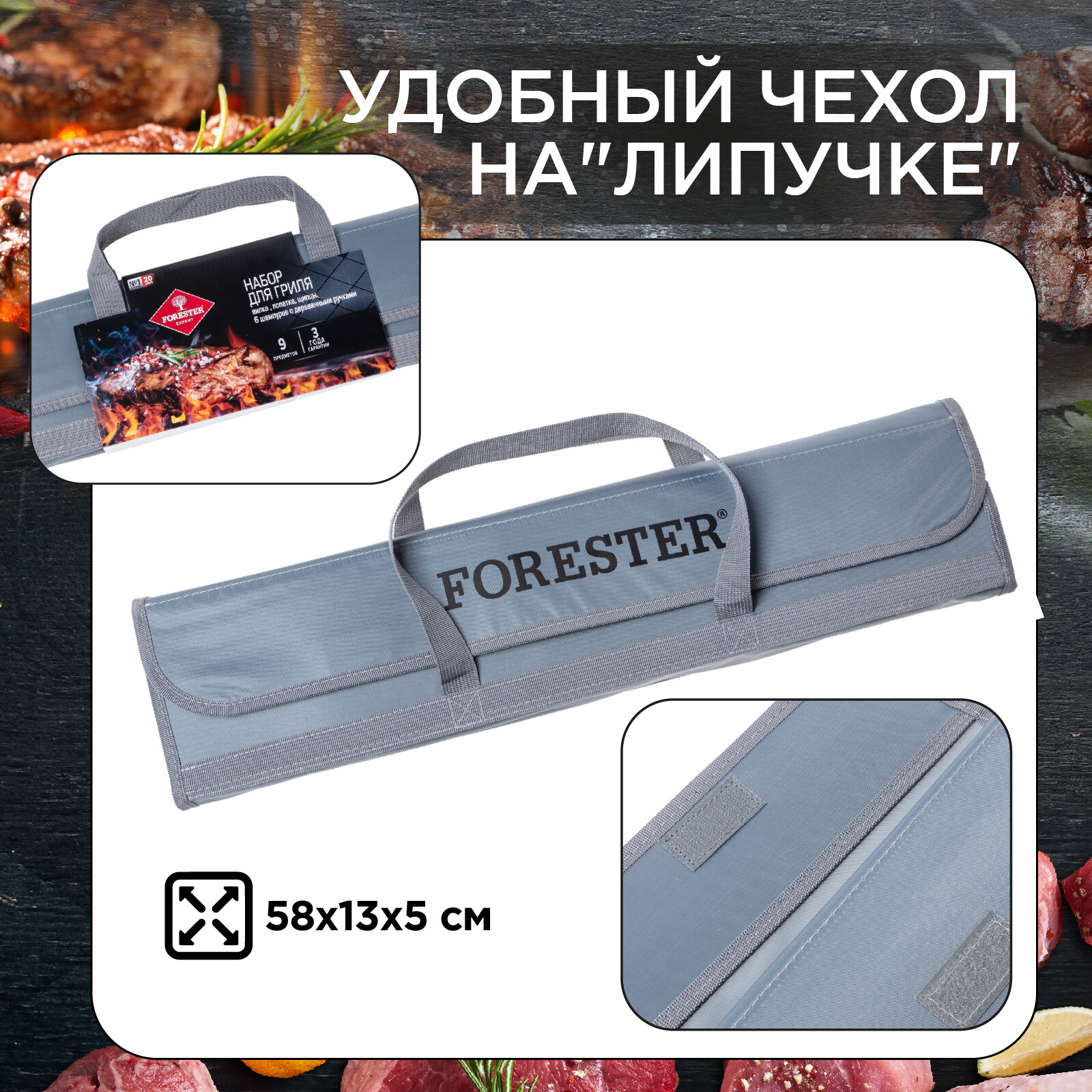 Набор аксессуаров для гриля в кофре Forester : вилка, лопатка, щипцы, 6 шампуров интересное:
