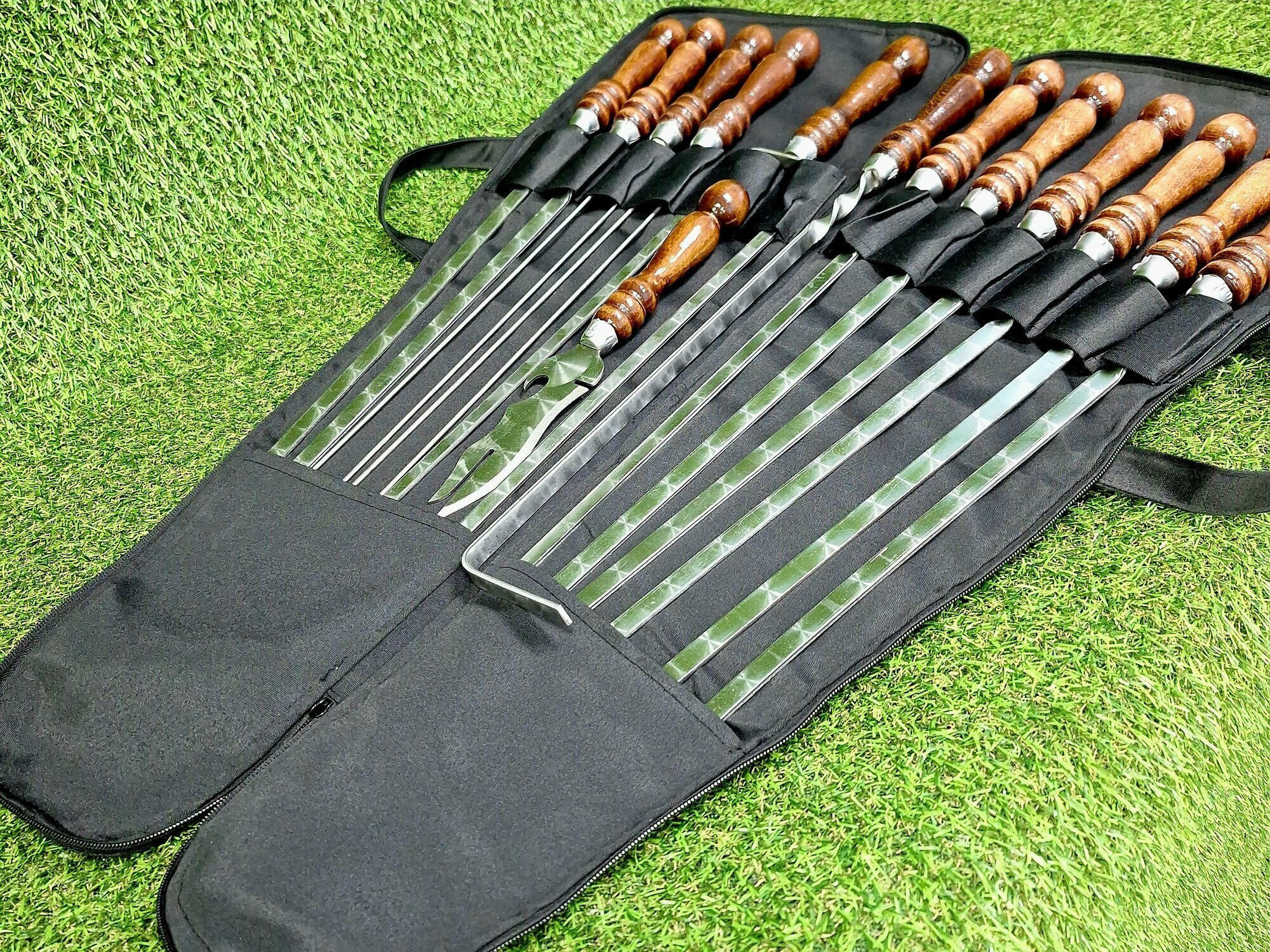 Набор шампуров в чехле "Мега Гриль" 13 предметов ( 8 шампуров, 2 спицы , двойной , кочерга , нож) интересное: