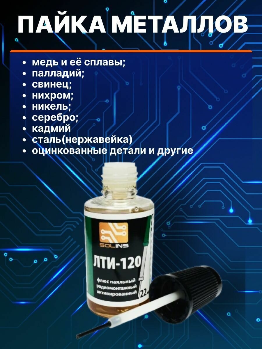 Флюс для пайки Solins ЛТИ-120 радиомонтажный, активированный, спирто-канифольный, с сосновой канифолью / Кислота паяльная для пайки печатных плат, меди, серебра, никеля и т.д., 100 мл