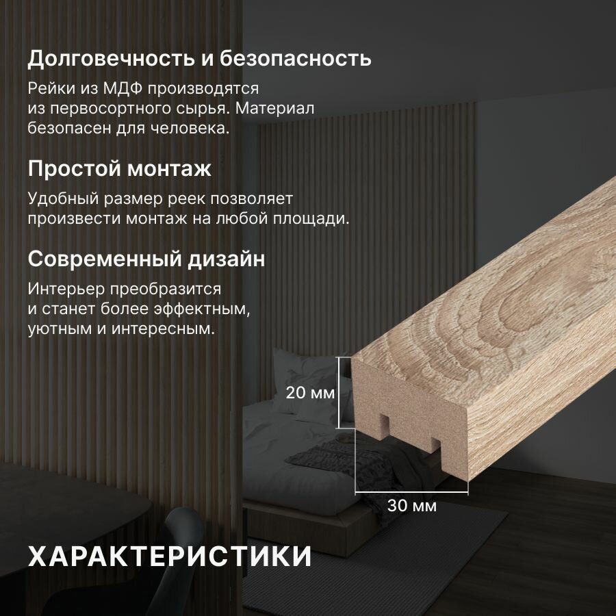 СохранитьРейка интерьерная МДФ декоративная, как деревянная; для стен, зонирования комнаты, детской, потолка, для перегородки или ниши; Цвет Дуб Сонома 2700*30*20 мм (упаковка 16 штук) интересное: