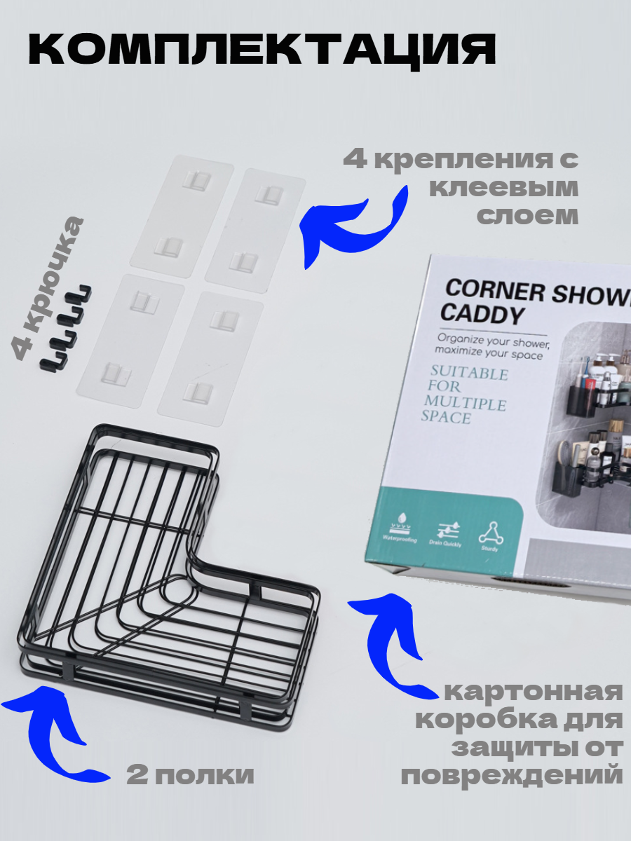 | Комплектация | 2 полки угловые металлические для ванной и 4 крючка, в картонной коробке |