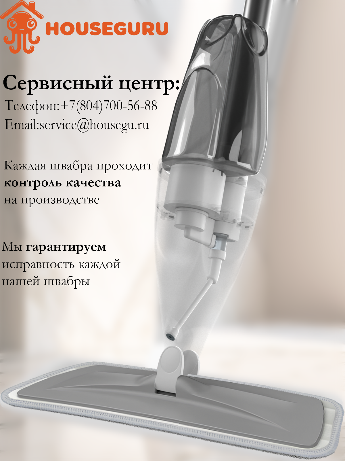 Швабра HOUSEGURU бежевая с распылителем, 2 насадки из микрофирбы, скребок, салфетка